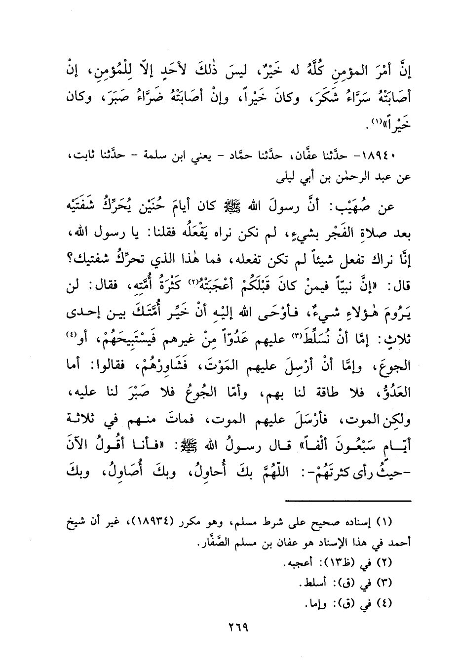 ١٨٩٤٠ - حَدَّثَنَا عَفَّانُ، حَدَّثَنَا حَمَّادٌ يَعْنِي ابْنَ سَلَمَةَ، حَدَّثَنَا ثَابِتٌ، عَنْ عَبْدِ الرَّحْمَنِ بْنِ أَبِي لَيْلَى، عَنْ صُهَيْبٍ، أَنَّ رَسُولَ اللهِ صَلَّى اللهُ عَلَيْهِ وَسَلَّمَ كَانَ أَيَّامَ حُنَيْنٍ يُحَرِّكُ شَفَتَيْهِ بَعْدَ صَلَاةِ الْفَجْرِ بِشَيْءٍ، لَمْ نَكُنْ نَرَاهُ يَفْعَلُهُ فَقُلْنَا: يَا رَسُولَ اللهِ، إِنَّا نَرَاكَ تَفْعَلُ شَيْئًا لَمْ تَكُنْ، تَفْعَلُهُ فَمَا هَذَا الَّذِي تُحَرِّكُ شَفَتَيْكَ؟ قَالَ: " إِنَّ نَبِيًّا فِيمَنْ كَانَ قَبْلَكُمْ أَعْجَبَتْهُ (٢) كَثْرَةُ أُمَّتِهِ، فَقَالَ: لَنْ يَرُومَ هَؤُلَاءِ شَيْءٌ فَأَوْحَى اللهُ إِلَيْهِ: أَنْ خَيِّرْ أُمَّتَكَ بَيْنَ إِحْدَى ثَلَاثٍ: إِمَّا أَنْ نُسَلِّطَ (٣) عَلَيْهِمْ عَدُوًّا مِنْ غَيْرِهِمْ فَيَسْتَبِيحَهُمْ، أَوِ (٤) الْجُوعَ، وَإِمَّا أَنْ أُرْسِلَ عَلَيْهِمُ الْمَوْتَ، فَشَاوَرَهُمْ، فَقَالُوا: أَمَّا الْعَدُوُّ، فَلَا طَاقَةَ لَنَا بِهِمْ، وَأَمَّا الْجُوعُ فَلَا صَبْرَ لَنَا عَلَيْهِ، وَلَكِنِ الْمَوْتُ، فَأَرْسَلَ عَلَيْهِمُ الْمَوْتَ، فَمَاتَ مِنْهُمْ فِي ثَلَاثَةِ أَيَّامٍ سَبْعُونَ أَلْفًا " قَالَ رَسُولُ اللهِ صَلَّى اللهُ عَلَيْهِ وَسَلَّمَ: " فَأَنَا أَقُولُ الْآنَ، حَيْثُ رَأَى كَثْرَتَهُمْ،: اللهُمَّ بِكَ أُحَاوِلُ، وَبِكَ أُصَاوِلُ، وَبِكَ
