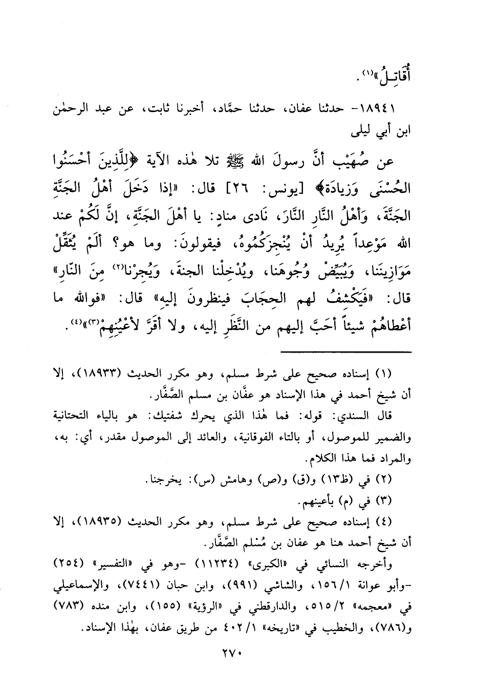 ١٨٩٤١ - حَدَّثَنَا عَفَّانُ، حَدَّثَنَا حَمَّادٌ، أَخْبَرَنَا ثَابِتٌ، عَنْ عَبْدِ الرَّحْمَنِ بْنِ أَبِي لَيْلَى، عَنْ صُهَيْبٍ، أَنَّ رَسُولَ اللهِ صَلَّى اللهُ عَلَيْهِ وَسَلَّمَ تَلَا هَذِهِ الْآيَةَ: {لِلَّذِينَ أَحْسَنُوا الْحُسْنَى وَزِيَادَةٌ} [يونس: ٢٦] قَالَ: " إِذَا دَخَلَ أَهْلُ الْجَنَّةِ الْجَنَّةَ، وَأَهْلُ النَّارِ النَّارَ، نَادَى مُنَادٍ: يَا أَهْلَ الْجَنَّةِ، إِنَّ لَكُمْ عِنْدَ اللهِ مَوْعِدًا يُرِيدُ أَنْ يُنْجِزَكُمُوهُ، فَيَقُولُونَ: وَمَا هُوَ؟ أَلَمْ يُثَقِّلْ مَوَازِينَنَا، وَيُبَيِّضْ وُجُوهَنَا، وَيُدْخِلْنَا الْجَنَّةَ، وَيُجِرْنَا (٢) مِنَ النَّارِ " قَالَ: " فَيُكْشَفُ لَهُمُ الْحِجَابُ فَيَنْظُرُونَ إِلَيْهِ " قَالَ: " فَوَاللهِ مَا أَعْطَاهُمْ شَيْئًا أَحَبَّ إِلَيْهِمْ مِنَ النَّظَرِ إِلَيْهِ، وَلَا أَقَرَّ لِأَعْيُنِهِمْ (٣) " (٤)