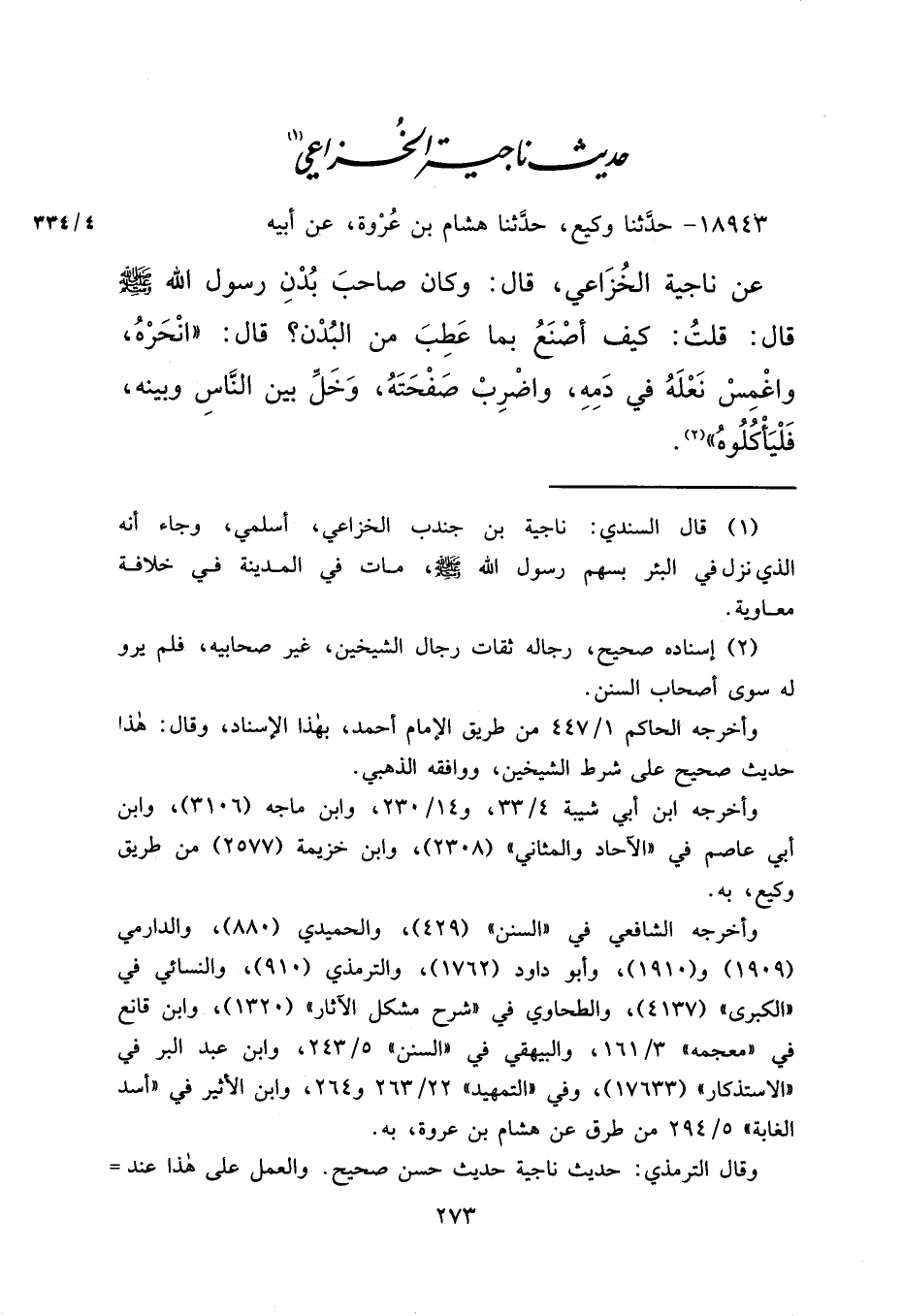 ١٨٩٤٣ - حَدَّثَنَا وَكِيعٌ، حَدَّثَنَا هِشَامُ بْنُ عُرْوَةَ، عَنْ أَبِيهِ، عَنْ نَاجِيَةَ الْخُزَاعِيِّ، قَالَ: وَكَانَ صَاحِبَ بُدْنِ رَسُولِ اللهِ صَلَّى اللهُ عَلَيْهِ وَسَلَّمَ، قَالَ: قُلْتُ: كَيْفَ أَصْنَعُ بِمَا عَطِبَ مِنَ الْبُدْنِ؟ قَالَ: " انْحَرْهُ، وَاغْمِسْ نَعْلَهُ فِي دَمِهِ، وَاضْرِبْ صَفْحَتَهُ، وَخَلِّ بَيْنَ النَّاسِ وَبَيْنَهُ، فَلْيَأْكُلُوهُ " (٢)