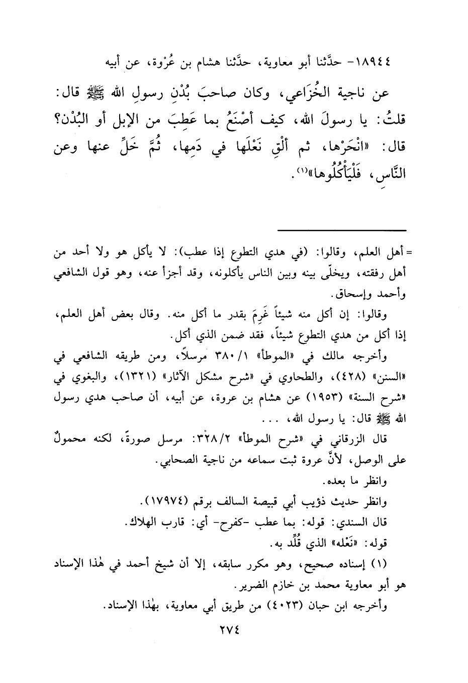 ١٨٩٤٤ - حَدَّثَنَا أَبُو مُعَاوِيَةَ، حَدَّثَنَا هِشَامُ بْنُ عُرْوَةَ، عَنْ أَبِيهِ، عَنْ نَاجِيَةَ الْخُزَاعِيِّ، وَكَانَ صَاحِبَ بُدْنِ رَسُولِ اللهِ صَلَّى اللهُ عَلَيْهِ وَسَلَّمَ قَالَ: قُلْتُ: يَا رَسُولَ اللهِ، كَيْفَ أَصْنَعُ بِمَا عَطِبَ مِنَ الْإِبِلِ أَوِ الْبُدْنِ؟ قَالَ: " انْحَرْهَا، ثُمَّ أَلْقِ نَعْلَهَا فِي دَمِهَا، ثُمَّ خَلِّ عَنْهَا وَعَنِ النَّاسِ، فَلْيَأْكُلُوهَا " (١)