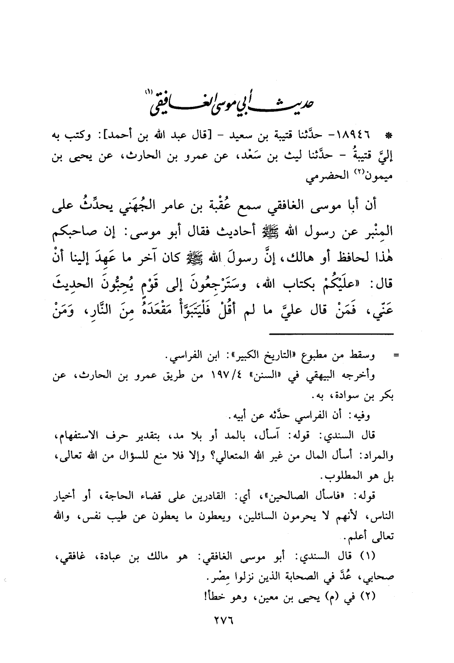 (١) قال السندي: أبو موسى الغافقي: هو مالك بن عبادة، غافقي، صحابي، عُدَّ في الصحابة الذين نزلوا مِصْر.