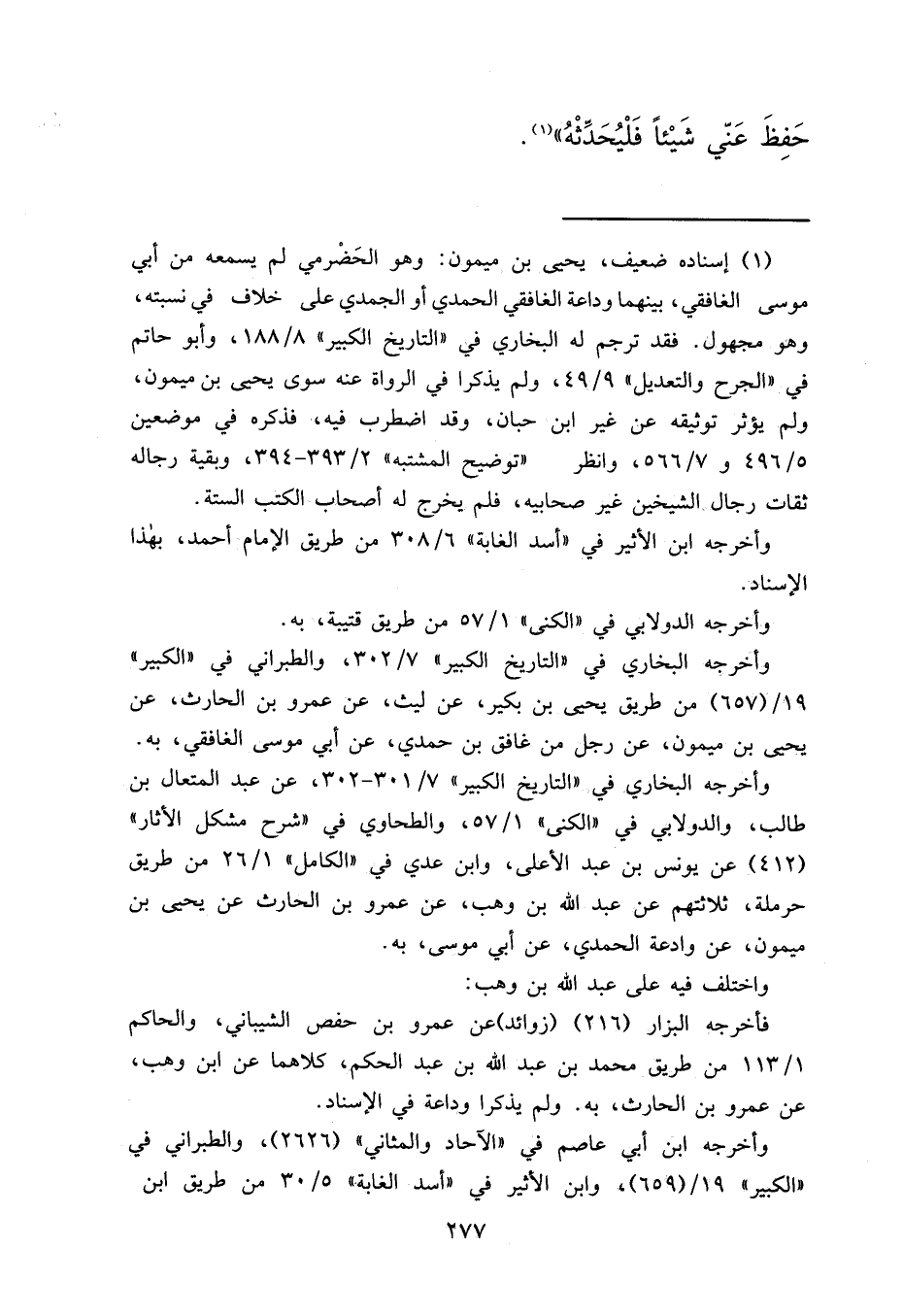 وأخرجه البخاري في "التاريخ الكبير" ٧/٣٠١-٣٠٢، عن عبد المتعال بن طالب، والدولابي في "الكنى" ١/٥٧، والطحاوي في "شرح مشكل الآثار" (٤١٢) عن يونس بن عبد الأعلى، وابن عدي في "الكامل" ١/٢٦ من طريق حرملة، ثلاثتهم عن عبد الله بن وهب، عن عمرو بن الحارث عن يحيى بن ميمون، عن وادعة الحمدي، عن أبي موسى، به.