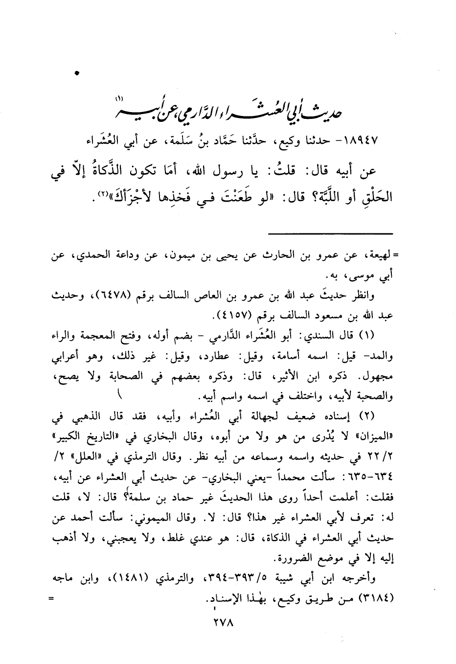 حَدِيثُ أَبِي الْعُشَرَاءِ الدَّارْمِيِّ عَنْ أَبِيهِ (١)