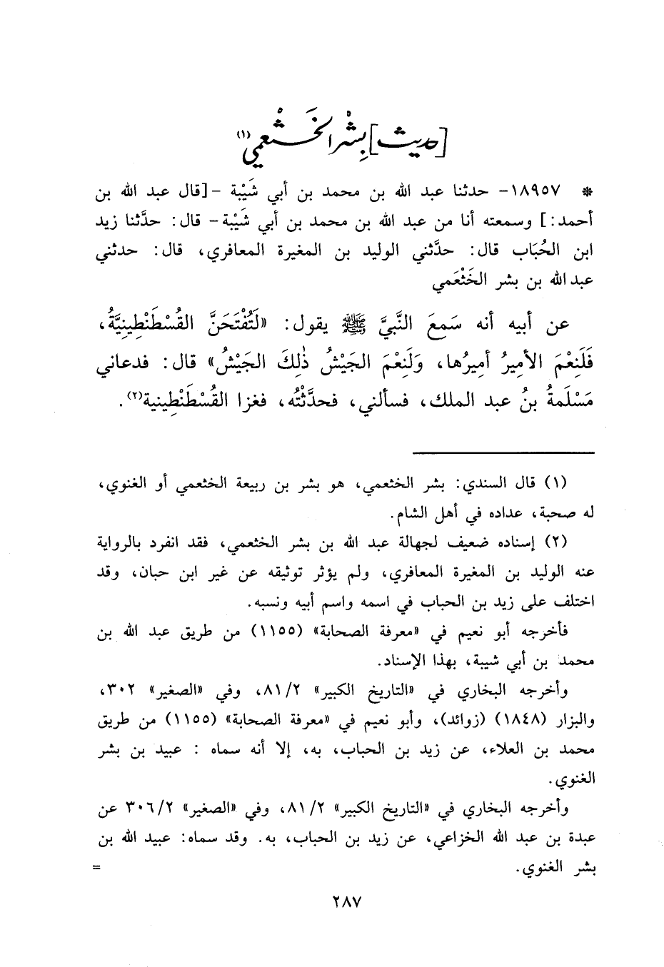 ١٨٩٥٧ - حَدَّثَنَا عَبْدُ اللهِ بْنُ مُحَمَّدِ بْنِ أَبِي شَيْبَةَ، قَالَ عَبْدُ اللهِ بْنُ أَحْمَدَ: وَسَمِعْتُهُ أَنَا مِنْ عَبْدِ اللهِ بْنِ مُحَمَّدِ بْنِ أَبِي شَيْبَةَ، قَالَ: حَدَّثَنَا زَيْدُ بْنُ الْحُبَابِ، قَالَ: حَدَّثَنِي الْوَلِيدُ بْنُ الْمُغِيرَةِ الْمَعَافِرِيُّ، قَالَ: حَدَّثَنِي عَبْدُ اللهِ بْنُ بِشْرٍ الْخَثْعَمِيُّ، عَنْ أَبِيهِ أَنَّهُ سَمِعَ النَّبِيَّ صَلَّى اللهُ عَلَيْهِ وَسَلَّمَ يَقُولُ: " لَتُفْتَحَنَّ الْقُسْطَنْطِينِيَّةُ، فَلَنِعْمَ الْأَمِيرُ أَمِيرُهَا، وَلَنِعْمَ الْجَيْشُ ذَلِكَ الْجَيْشُ ". قَالَ: فَدَعَانِي مَسْلَمَةُ بْنُ عَبْدِ الْمَلِكِ فَسَأَلَنِي، فَحَدَّثْتُهُ، فَغَزَا الْقُسْطَنْطِينِيَّةَ (٢)