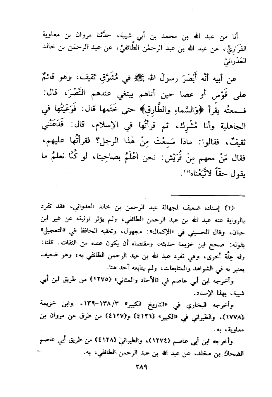 أَنَا مِنْ عَبْدِ اللهِ بْنِ مُحَمَّدِ بْنِ أَبِي شَيْبَةَ، حَدَّثَنَا مَرْوَانُ بْنُ مُعَاوِيَةَ الْفَزَارِيُّ، عَنْ عَبْدِ اللهِ بْنِ عَبْدِ الرَّحْمَنِ الطَّائِفِيِّ، عَنْ عَبْدِ الرَّحْمَنِ بْنِ خَالِدٍ الْعَدْوَانِيِّ، عَنْ أَبِيهِ، أَنَّهُ أَبْصَرَ رَسُولَ اللهِ صَلَّى اللهُ عَلَيْهِ وَسَلَّمَ فِي مَشْرِقِ ثَقِيفٍ، وَهُوَ قَائِمٌ عَلَى قَوْسٍ، أَوْ عَصًا حِينَ أَتَاهُمْ يَبْتَغِي عِنْدَهُمُ النَّصْرَ، قَالَ: " فَسَمِعْتُهُ يَقْرَأُ: وَالسَّمَاءِ وَالطَّارِقِ حَتَّى خَتَمَهَا "، قَالَ: فَوَعَيْتُهَا فِي الْجَاهِلِيَّةِ وَأَنَا مُشْرِكٌ، ثُمَّ قَرَأْتُهَا فِي الْإِسْلَامِ، قَالَ: فَدَعَتْنِي ثَقِيفٌ فَقَالُوا: مَاذَا سَمِعْتَ مِنْ هَذَا الرَّجُلِ؟ فَقَرَأْتُهَا عَلَيْهِمْ، فَقَالَ مَنْ مَعَهُمْ مِنْ قُرَيْشٍ: نَحْنُ أَعْلَمُ بِصَاحِبِنَا، لَوْ كُنَّا نَعْلَمُ مَا يَقُولُ حَقًّا لَاتَّبَعْنَاهُ (١)