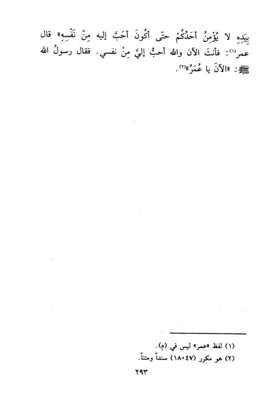 بِيَدِهِ، لَا يُؤْمِنُ أَحَدُكُمْ حَتَّى أَكُونَ أَحَبَّ إِلَيْهِ مِنْ نَفْسِهِ ". قَالَ عُمَرُ: (١) فَأَنْتَ الْآنَ وَاللهِ أَحَبُّ إِلَيَّ مِنْ نَفْسِي، فَقَالَ رَسُولُ اللهِ صَلَّى اللهُ عَلَيْهِ وَسَلَّمَ: " الْآنَ يَا عُمَرُ " (٢)