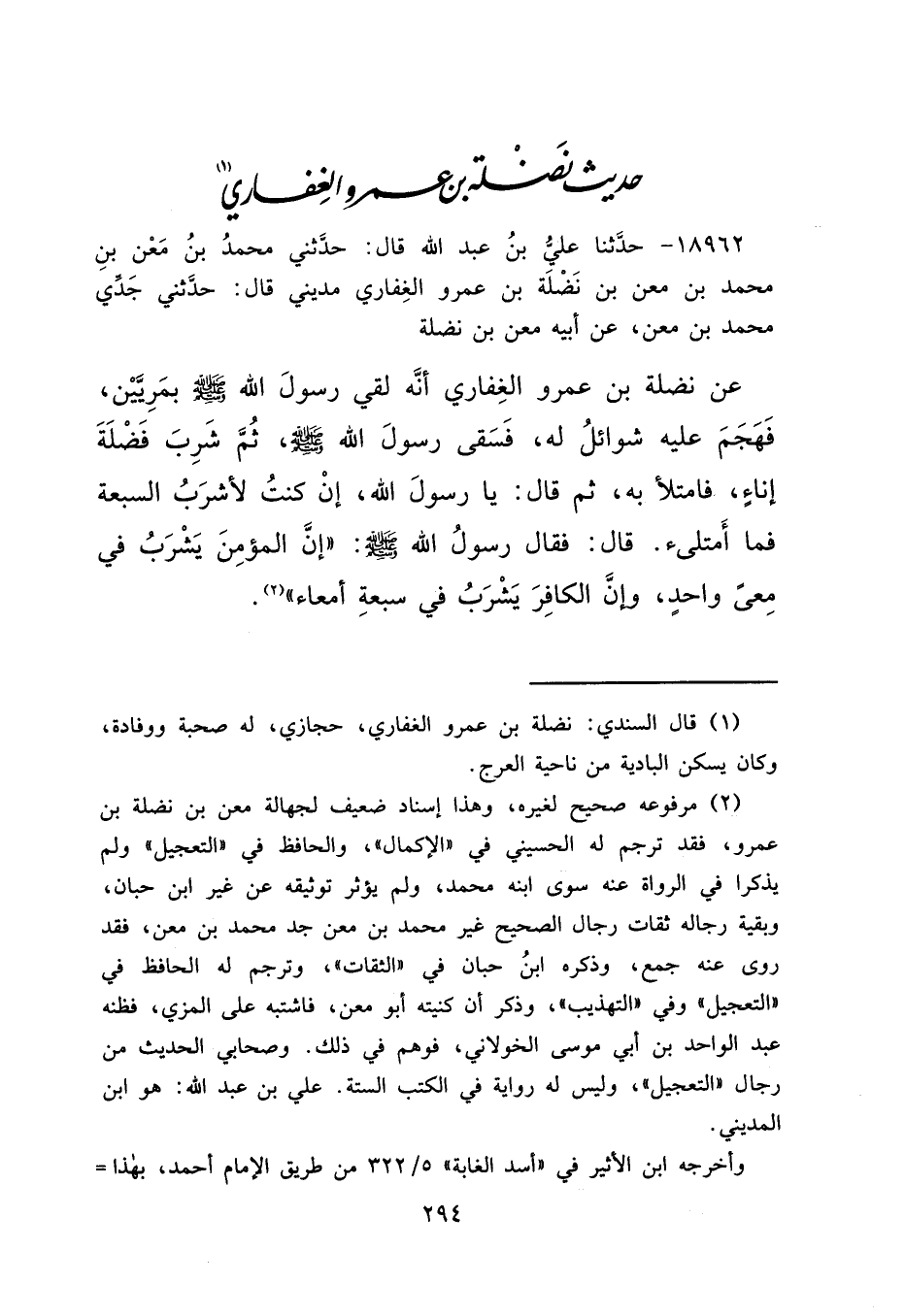 ١٨٩٦٢ - حَدَّثَنَا عَلِيُّ بْنُ عَبْدِ اللهِ، قَالَ: حَدَّثَنِي مُحَمَّدُ بْنُ مَعْنِ بْنِ مُحَمَّدِ بْنِ مَعْنِ بْنِ نَضْلَةَ بْنِ عَمْرٍو الْغِفَارِيُّ مَدِينِيٌّ، قَالَ: حَدَّثَنِي جَدِّي مُحَمَّدُ بْنُ مَعْنٍ، عَنْ أَبِيهِ مَعْنِ بْنِ نَضْلَةَ، عَنْ نَضْلَةَ بْنِ عَمْرٍو الْغِفَارِيِّ، أَنَّهُ لَقِيَ رَسُولَ اللهِ صَلَّى اللهُ عَلَيْهِ وَسَلَّمَ بِمَرَّيَيْنَ، فَهَجَمَ عَلَيْهِ شَوَائِلُ لَهُ، فَسَقَى رَسُولَ اللهِ صَلَّى اللهُ عَلَيْهِ وَسَلَّمَ، ثُمَّ شَرِبَ فَضْلَةَ إِنَاءٍ، فَامْتَلَأَ بِهِ، ثُمَّ قَالَ: يَا رَسُولَ اللهِ، إِنْ كُنْتُ لَأَشْرَبُ السَّبْعَةَ فَمَا أَمْتَلِئُ؟ قَالَ: فَقَالَ رَسُولُ اللهِ صَلَّى اللهُ عَلَيْهِ وَسَلَّمَ: " إِنَّ الْمُؤْمِنَ يَشْرَبُ فِي مِعًى وَاحِدٍ، وَإِنَّ الْكَافِرَ يَشْرَبُ فِي سَبْعَةِ أَمْعَاءٍ " (٢)
