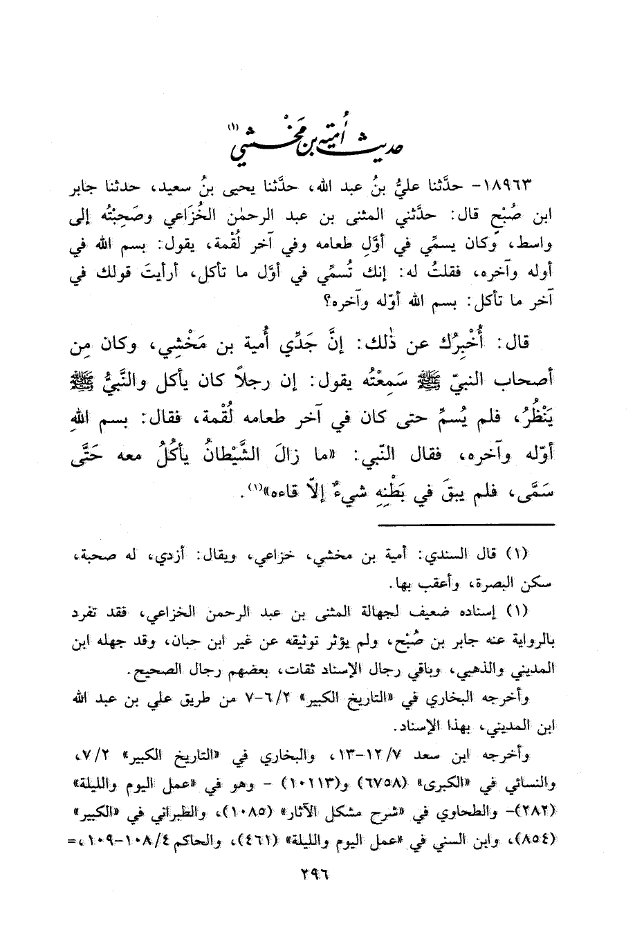 ١٨٩٦٣ - حَدَّثَنَا عَلِيُّ بْنُ عَبْدِ اللهِ، حَدَّثَنَا يَحْيَى بْنُ سَعِيدٍ، حَدَّثَنَا جَابِرُ بْنُ صُبْحٍ، قَالَ: حَدَّثَنِي الْمُثَنَّى بْنُ عَبْدِ الرَّحْمَنِ الْخُزَاعِيُّ، وَصَحِبْتُهُ إِلَى وَاسِطٍ، وَكَانَ يُسَمِّي فِي أَوَّلِ طَعَامِهِ، وَفِي آخِرِ لُقْمَةٍ يَقُولُ: بِسْمِ اللهِ فِي أَوَّلِهِ وَآخِرِهِ، فَقُلْتُ لَهُ: إِنَّكَ تُسَمِّي فِي أَوَّلِ مَا تَأْكُلُ، أَرَأَيْتَ قَوْلَكَ فِي آخِرِ مَا تَأْكُلُ بِسْمِ اللهِ أَوَّلَهُ وَآخِرَهُ، قَالَ: أُخْبِرُكَ عَنْ ذَلِكَ، إِنَّ جَدِّي أُمَيَّةَ بْنَ مَخْشِيٍّ، وَكَانَ مِنْ أَصْحَابِ النَّبِيِّ صَلَّى اللهُ عَلَيْهِ وَسَلَّمَ، سَمِعْتُهُ يَقُولُ: إِنَّ رَجُلًا كَانَ يَأْكُلُ وَالنَّبِيُّ صَلَّى اللهُ عَلَيْهِ وَسَلَّمَ يَنْظُرُ، فَلَمْ يُسَمِّ حَتَّى كَانَ فِي آخِرِ طَعَامِهِ لُقْمَةٌ، فَقَالَ: بِسْمِ اللهِ أَوَّلَهُ وَآخِرَهُ، فَقَالَ النَّبِيُّ صَلَّى اللهُ عَلَيْهِ وَسَلَّمَ: " مَا زَالَ الشَّيْطَانُ يَأْكُلُ مَعَهُ حَتَّى سَمَّى، فَلَمْ يَبْقَ فِي بَطْنِهِ شَيْءٌ، إِلَّا قَاءَهُ " (١)