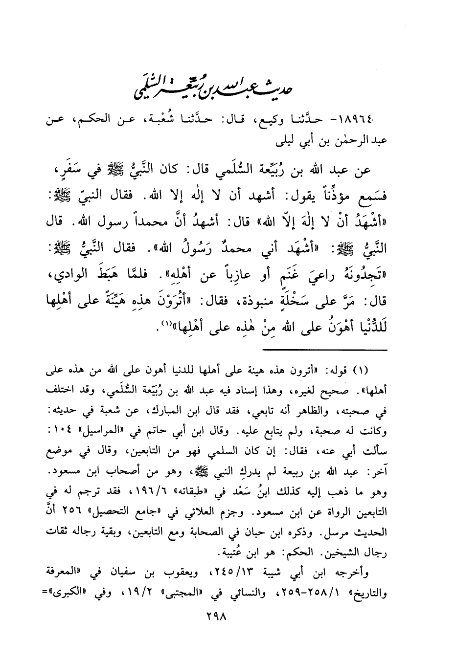١٨٩٦٤ - حَدَّثَنَا وَكِيعٌ، قَالَ: حَدَّثَنَا شُعْبَةُ، عَنِ الْحَكَمِ، عَنْ عَبْدِ الرَّحْمَنِ بْنِ أَبِي لَيْلَى، عَنْ عَبْدِ اللهِ بْنِ رَبِيعَةَ السُّلَمِيِّ، قَالَ: كَانَ النَّبِيُّ صَلَّى اللهُ عَلَيْهِ وَسَلَّمَ فِي سَفَرٍ، فَسَمِعَ مُؤَذِّنًا يَقُولُ: أَشْهَدُ أَنْ لَا إِلَهَ إِلَّا اللهُ، فَقَالَ النَّبِيُّ صَلَّى اللهُ عَلَيْهِ وَسَلَّمَ: " أَشْهَدُ أَنْ لَا إِلَهَ إِلَّا اللهُ "، قَالَ: أَشْهَدُ أَنَّ مُحَمَّدًا رَسُولُ اللهِ، قَالَ النَّبِيُّ صَلَّى اللهُ عَلَيْهِ وَسَلَّمَ: ١٠ " أَشْهَدُ أَنِّي مُحَمَّدٌ رَسُولُ اللهِ "، فَقَالَ النَّبِيُّ صَلَّى اللهُ عَلَيْهِ وَسَلَّمَ: " تَجِدُونَهُ رَاعِيَ غَنَمٍ، أَوْ عَازِبًا عَنْ أَهْلِهِ ". فَلَمَّا هَبَطَ الْوَادِي، قَالَ: مَرَّ عَلَى سَخْلَةٍ مَنْبُوذَةٍ، فَقَالَ: " أَتَرَوْنَ هَذِهِ هَيِّنَةً عَلَى أَهْلِهَا لَلدُّنْيَا أَهْوَنُ عَلَى اللهِ مِنْ هَذِهِ عَلَى أَهْلِهَا " (١)