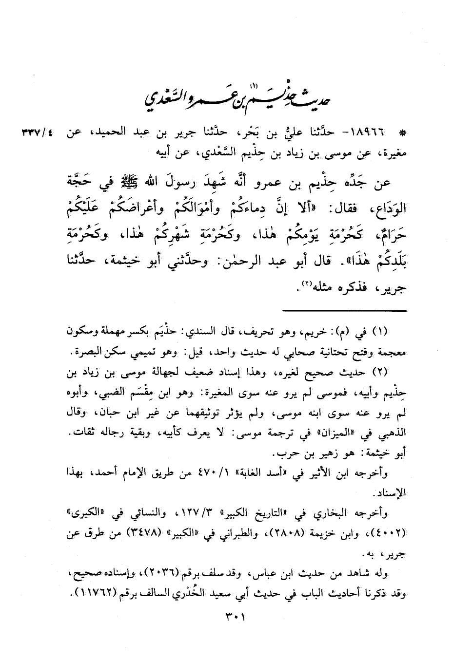 ١٨٩٦٦ - حَدَّثَنَا عَلِيُّ بْنُ بَحْرٍ، حَدَّثَنَا جَرِيرُ بْنُ عَبْدِ الْحَمِيدِ، عَنْ مُغِيرَةَ، عَنْ مُوسَى بْنِ زِيَادِ بْنِ حِذْيَمٍ السَّعْدِيِّ، عَنْ أَبِيهِ، عَنْ جَدِّهِ، حِذْيَمٍ بْنِ عَمْرٍو، أَنَّهُ شَهِدَ رَسُولَ اللهِ صَلَّى اللهُ عَلَيْهِ وَسَلَّمَ فِي حَجَّةِ الْوَدَاعِ، فَقَالَ: " أَلَا إِنَّ دِمَاءَكُمْ وَأَمْوَالَكُمْ وَأَعْرَاضَكُمْ عَلَيْكُمْ حَرَامٌ، كَحُرْمَةِ يَوْمِكُمْ هَذَا، وَكَحُرْمَةِ شَهْرِكُمْ هَذَا، وَكَحُرْمَةِ بَلَدِكُمْ هَذَا ". قَالَ أَبُو عَبْدِ الرَّحْمَنِ وحَدَّثَنِي أَبُو خَيْثَمَةَ، حَدَّثَنَا جَرِيرٌ فَذَكَرَهُ مِثْلَهُ (٢)