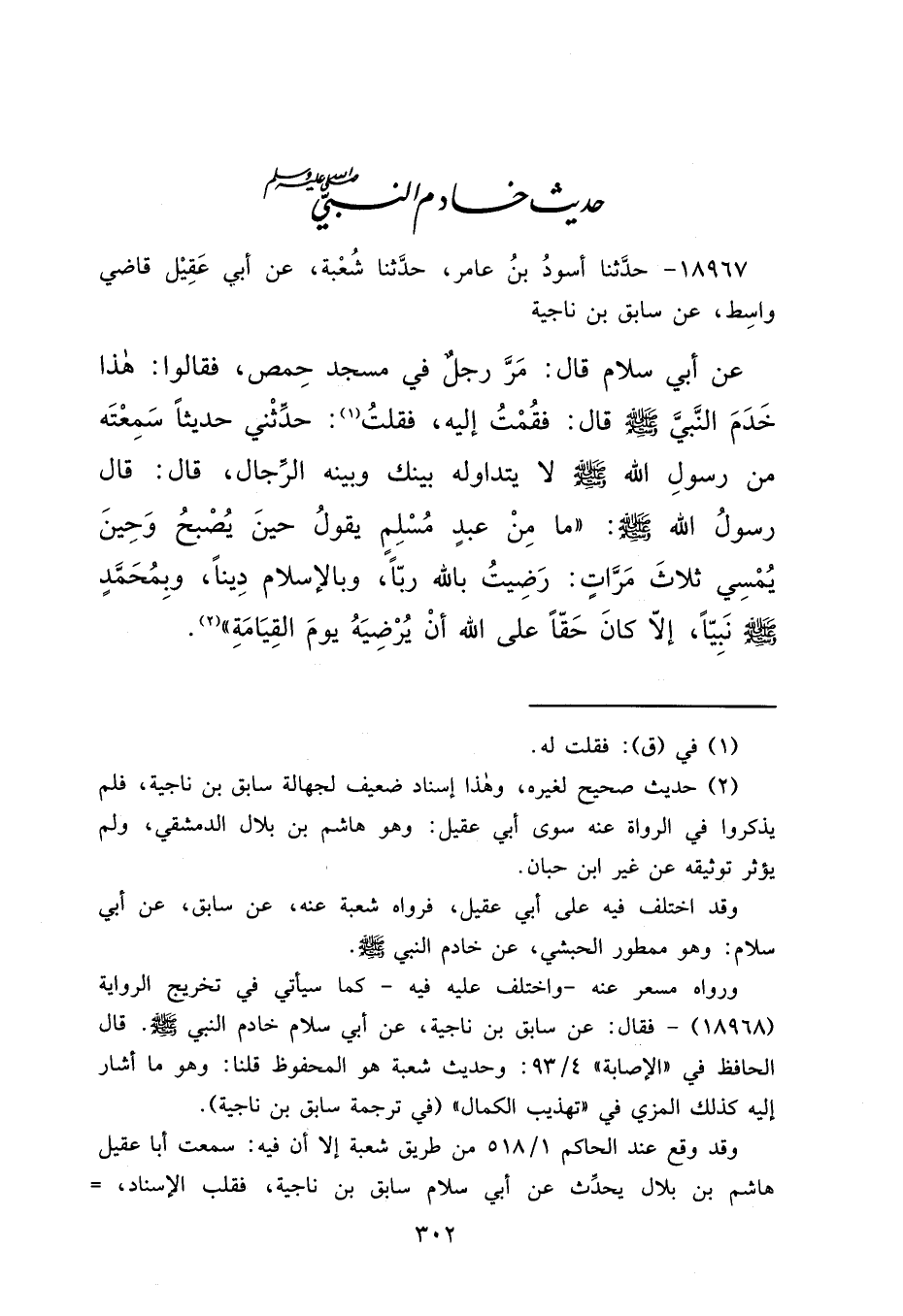 ١٨٩٦٧ - حَدَّثَنَا أَسْوَدُ بْنُ عَامِرٍ، حَدَّثَنَا شُعْبَةُ، عَنْ أَبِي عَقِيلٍ، قَاضِي وَاسِطٍ، عَنْ سَابِقِ بْنِ نَاجِيَةَ، عَنْ أَبِي سَلَّامٍ، قَالَ: مَرَّ رَجُلٌ فِي مَسْجِدِ حِمْصَ، فَقَالُوا: هَذَا خَادِمُ النَّبِيِّ، صَلَّى اللهُ عَلَيْهِ وَسَلَّمَ، قَالَ: فَقُمْتُ إِلَيْهِ، فَقُلْتُ: (١) حَدِّثْنِي حَدِيثًا سَمِعْتَهُ مِنْ رَسُولِ اللهِ صَلَّى اللهُ عَلَيْهِ وَسَلَّمَ، لَا يَتَدَاوَلُهُ بَيْنَكَ وَبَيْنَهُ الرِّجَالُ، قَالَ: قَالَ رَسُولُ اللهِ صَلَّى اللهُ عَلَيْهِ وَسَلَّمَ: " مَا مِنْ عَبْدٍ مُسْلِمٍ يَقُولُ حِينَ يُصْبِحُ وَحِينَ يُمْسِي ثَلَاثَ مَرَّاتٍ: رَضِيتُ بِاللهِ رَبًّا، وَبِالْإِسْلَامِ دِينًا، وَبِمُحَمَّدٍ صَلَّى اللهُ عَلَيْهِ وَسَلَّمَ نَبِيًّا، إِلَّا كَانَ حَقًّا عَلَى اللهِ أَنْ يُرْضِيَهُ يَوْمَ الْقِيَامَةِ " (٢)