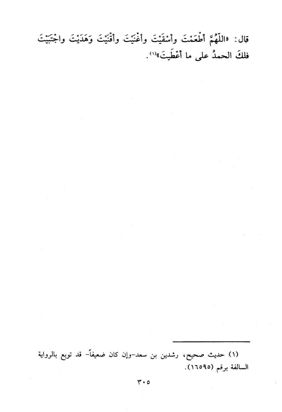 قَالَ: " اللهُمَّ أَطْعَمْتَ وَأَسْقَيْتَ، وَأَغْنَيْتَ، وَأَقْنَيْتَ، وَهَدَيْتَ، وَاجْتَبَيْتَ، فَلَكَ الْحَمْدُ عَلَى مَا أَعْطَيْتَ " (١)
