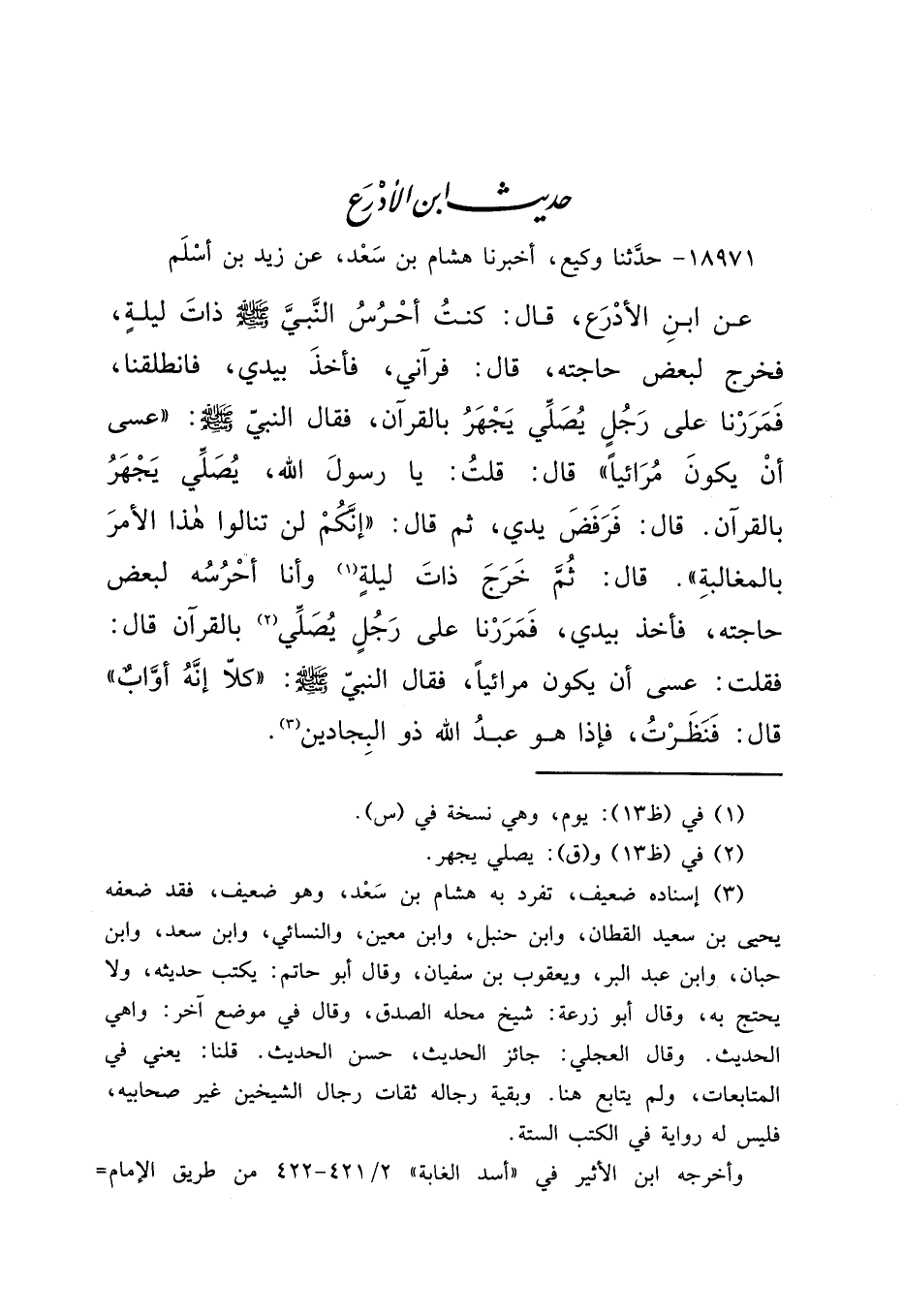 ١٨٩٧١ - حَدَّثَنَا وَكِيعٌ، أَخْبَرَنَا هِشَامُ بْنُ سَعْدٍ، عَنْ زَيْدِ بْنِ أَسْلَمَ، عَنِ ابْنِ الْأَدْرَعِ قَالَ: كُنْتُ أَحْرُسُ النَّبِيَّ صَلَّى اللهُ عَلَيْهِ وَسَلَّمَ ذَاتَ لَيْلَةٍ، فَخَرَجَ لِبَعْضِ حَاجَتِهِ، قَالَ: فَرَآنِي، فَأَخَذَ بِيَدِي، فَانْطَلَقْنَا، فَمَرَرْنَا عَلَى رَجُلٍ يُصَلِّي يَجْهَرُ بِالْقُرْآنِ، فَقَالَ النَّبِيُّ صَلَّى اللهُ عَلَيْهِ وَسَلَّمَ: " عَسَى أَنْ يَكُونَ مُرَائِيًا " قَالَ: قُلْتُ: يَا رَسُولَ اللهِ، يُصَلِّي يَجْهَرُ بِالْقُرْآنِ، قَالَ: فَرَفَضَ يَدِي، ثُمَّ قَالَ: " إِنَّكُمْ لَنْ تَنَالُوا هَذَا الْأَمْرَ بِالْمُغَالَبَةِ " قَالَ: ثُمَّ خَرَجَ ذَاتَ لَيْلَةٍ، (١) وَأَنَا أَحْرُسُهُ لِبَعْضِ حَاجَتِهِ، فَأَخَذَ بِيَدِي، فَمَرَرْنَا عَلَى رَجُلٍ يُصَلِّي (٢) بِالْقُرْآنِ، قَالَ: فَقُلْتُ: عَسَى أَنْ يَكُونَ مُرَائِيًا، فَقَالَ النَّبِيُّ صَلَّى اللهُ عَلَيْهِ وَسَلَّمَ: " كَلَّا إِنَّهُ أَوَّابٌ " قَالَ: فَنَظَرْتُ، فَإِذَا هُوَ عَبْدُ اللهِ ذُو الْبِجَادَيْنِ (٣)
