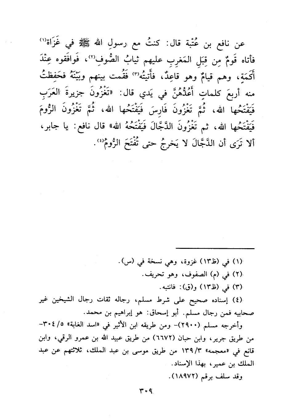عَنْ نَافِعِ بْنِ عُتْبَةَ قَالَ: كُنْتُ مَعَ رَسُولِ اللهِ صَلَّى اللهُ عَلَيْهِ وَسَلَّمَ فِي غَزَاةٍ، (١) فَأَتَاهُ قَوْمٌ مِنْ قِبَلِ الْمَغْرِبِ، عَلَيْهِمْ ثِيَابُ الصُّوفِ، (٢) فَوَافَقُوهُ عِنْدَ أَكَمَةٍ، وَهُمْ قِيَامٌ وَهُوَ قَاعِدٌ، فَأَتَيْتُهُ (٣) ، فَقُمْتُ بَيْنَهُمْ وَبَيْنَهُ، فَحَفِظْتُ مِنْهُ أَرْبَعَ كَلِمَاتٍ أَعُدُّهُنَّ فِي يَدِي قَالَ: " تَغْزُونَ جَزِيرَةَ الْعَرَبِ فَيَفْتَحُهَا اللهُ، ثُمَّ تَغْزُونَ فَارِسَ فَيَفْتَحُهَا اللهُ، ثُمَّ تَغْزُونَ الرُّومَ فَيَفْتَحُهَا اللهُ، ثُمَّ تَغْزُونَ الدَّجَّالَ فَيَفْتَحُهُ اللهُ " قَالَ نَافِعٌ: " يَا جَابِرُ أَلَا تَرَى أَنَّ الدَّجَّالَ لَا يَخْرُجُ حَتَّى تُفْتَحَ الرُّومُ " (٤)