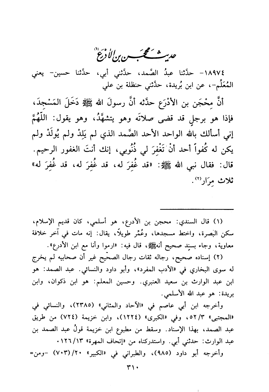 ١٨٩٧٤ - حَدَّثَنَا عَبْدُ الصَّمَدِ، حَدَّثَنِي أَبِي، حَدَّثَنَا حُسَيْنٌ يَعْنِي الْمُعَلِّمَ، عَنِ ابْنِ بُرَيْدَةَ، حَدَّثَنِي حَنْظَلَةُ بْنُ عَلِيٍّ، أَنَّ مِحْجَنَ بْنَ الْأَدْرَعِ، حَدَّثَهُ، أَنَّ رَسُولَ اللهِ صَلَّى اللهُ عَلَيْهِ وَسَلَّمَ دَخَلَ الْمَسْجِدَ، فَإِذَا هُوَ بِرَجُلٍ قَدْ قَضَى صَلَاتَهُ وَهُوَ يَتَشَهَّدُ وَهُوَ يَقُولُ: اللهُمَّ إِنِّي أَسْأَلُكَ بِاللهِ الْوَاحِدِ الْأَحَدِ الصَّمَدِ الَّذِي لَمْ يَلِدْ وَلَمْ يُولَدْ وَلَمْ يَكُنْ لَهُ كُفُوًا أَحَدٌ، أَنْ تَغْفِرَ لِي ذُنُوبِي، إِنَّكَ أَنْتَ الْغَفُورُ الرَّحِيمُ "، قَالَ: فَقَالَ نَبِيُّ اللهِ صَلَّى اللهُ عَلَيْهِ وَسَلَّمَ: " قَدْ غُفِرَ لَهُ، قَدْ غُفِرَ لَهُ، قَدْ غُفِرَ لَهُ " ثَلَاثَ مِرَارٍ (٢)