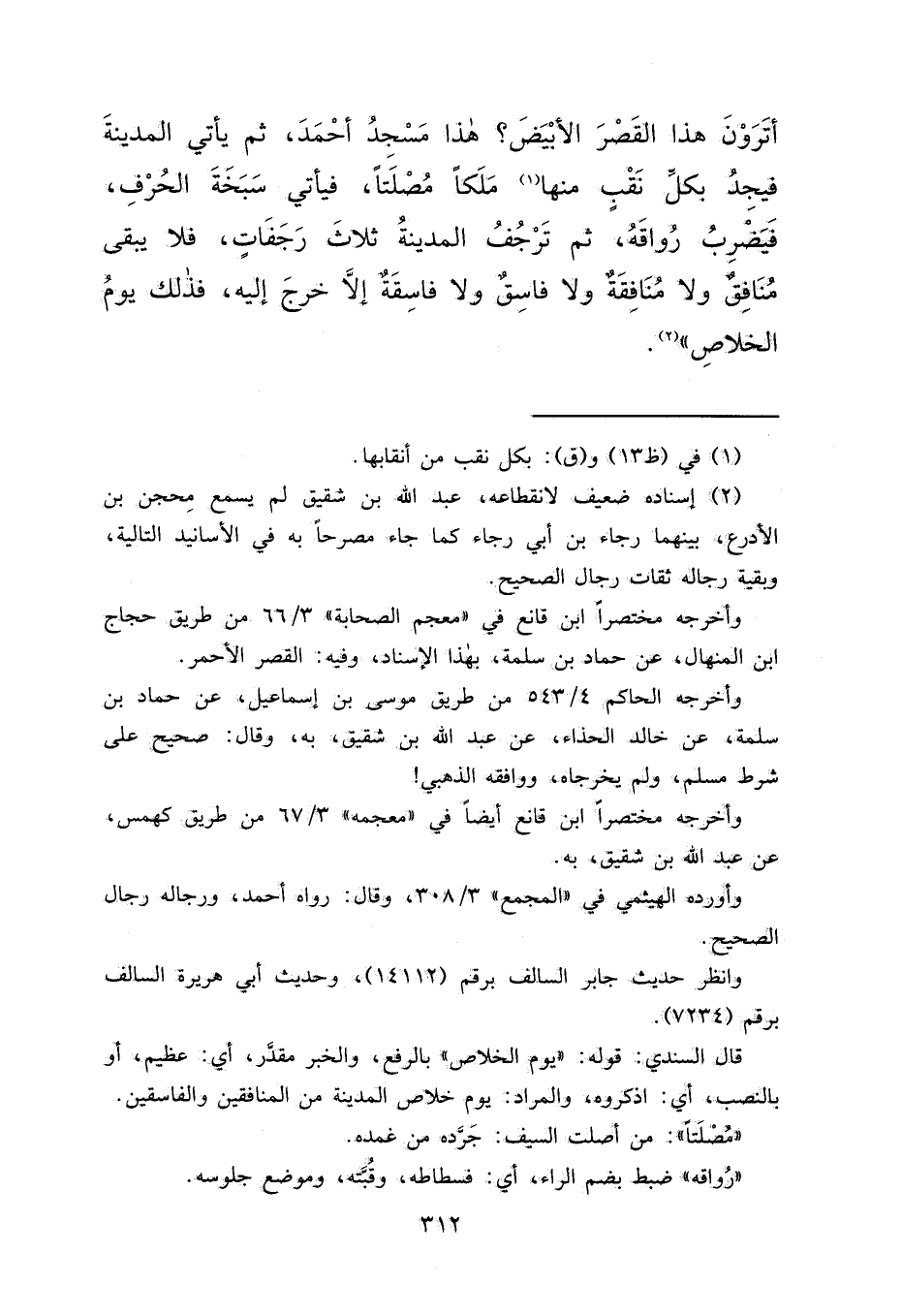 أَتَرَوْنَ هَذَا الْقَصْرَ الْأَبْيَضَ؟ هَذَا مَسْجِدُ أَحْمَدَ ثُمَّ يَأْتِي الْمَدِينَةَ، فَيَجِدُ بِكُلِّ نَقْبٍ مِنْهَا (١) مَلَكًا مُصْلِتًا، فَيَأْتِي سَبْخَةَ الْحَرْفِ، فَيَضْرِبُ رُوَاقَهُ، ثُمَّ تَرْجُفُ الْمَدِينَةُ ثَلَاثَ رَجَفَاتٍ، فَلَا يَبْقَى مُنَافِقٌ، وَلَا مُنَافِقَةٌ، وَلَا فَاسِقٌ، وَلَا فَاسِقَةٌ، إِلَّا خَرَجَ إِلَيْهِ، فَذَلِكَ يَوْمُ الْخَلَاصِ " (٢)