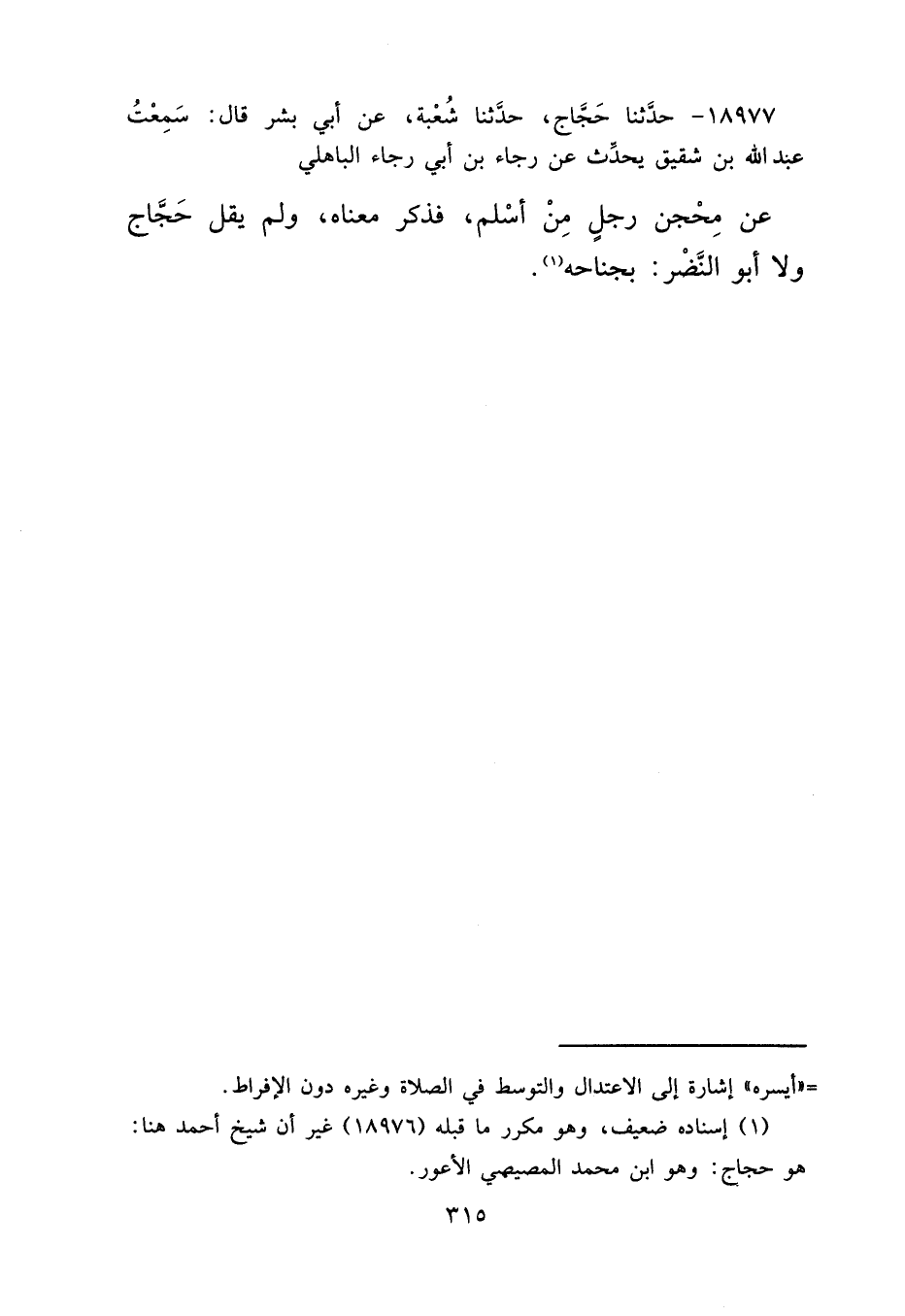 ١٨٩٧٧ - حَدَّثَنَا حَجَّاجٌ، حَدَّثَنَا شُعْبَةُ، عَنْ أَبِي بِشْرٍ قَالَ: سَمِعْتُ عَبْدَ اللهِ بْنَ شَقِيقٍ يُحَدِّثُ، عَنْ رَجَاءِ بْنِ أَبِي رَجَاءٍ الْبَاهِلِيِّ، عَنْ مِحْجَنٍ رَجُلٍ مِنْ أَسْلَمَ، فَذَكَرَ مَعْنَاهُ وَلَمْ يَقُلْ حَجَّاجٌ وَلَا أَبُو النَّضْرِ: بِجَنَاحِهِ (١)