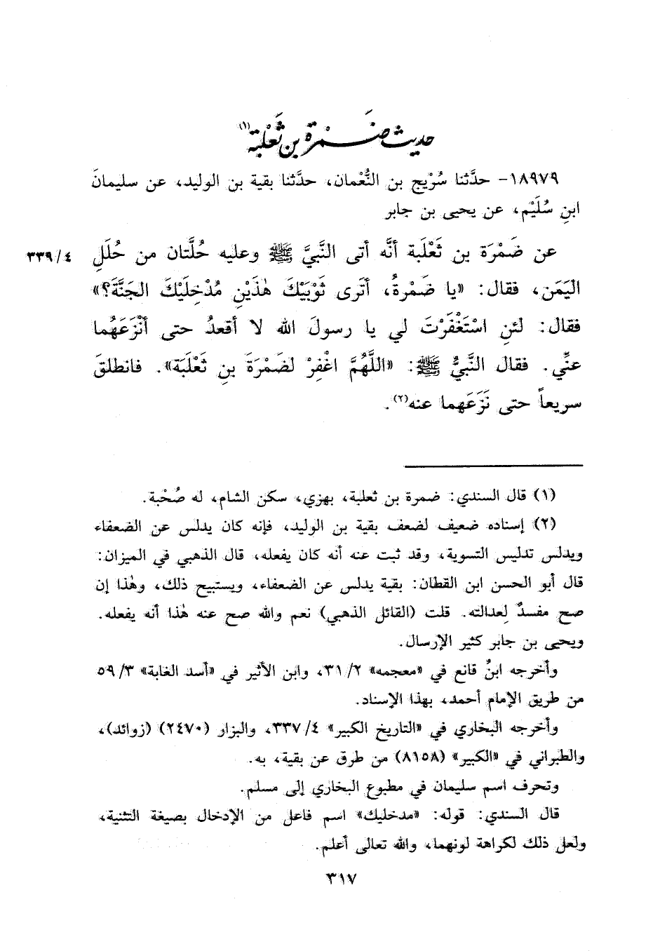 ١٨٩٧٩ - حَدَّثَنَا سُرَيْجُ بْنُ النُّعْمَانِ، حَدَّثَنَا بَقِيَّةُ بْنُ الْوَلِيدِ، عَنْ سُلَيْمَانَ بْنِ سُلَيْمٍ، عَنْ يَحْيَى بْنِ جَابِرٍ، عَنْ ضَمْرَةَ بْنِ ثَعْلَبَةَ، أَنَّهُ أَتَى النَّبِيَّ صَلَّى اللهُ عَلَيْهِ وَسَلَّمَ وَعَلَيْهِ حُلَّتَانِ مِنْ حُلَلِ الْيَمَنِ، فَقَالَ: " يَا ضَمْرَةُ، أَتَرَى ثَوْبَيْكَ هَذَيْنِ مُدْخِلَيْكَ الْجَنَّةَ؟ "، فَقَالَ: لَئِنْ اسْتَغْفَرْتَ لِي يَا رَسُولَ اللهِ، لَا أَقْعُدُ حَتَّى أَنْزَعَهُمَا عَنِّي، فَقَالَ النَّبِيُّ صَلَّى اللهُ عَلَيْهِ وَسَلَّمَ: " اللهُمَّ اغْفِرْ لِضَمْرَةَ بْنِ ثَعْلَبَةَ " فَانْطَلَقَ سَرِيعًا حَتَّى نَزَعَهُمَا عَنْهُ (٢)