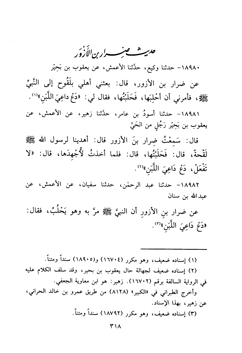 ١٨٩٨٢ - حَدَّثَنَا عَبْدُ الرَّحْمَنِ، حَدَّثَنَا سُفْيَانُ، عَنِ الْأَعْمَشِ، عَنْ عَبْدِ اللهِ بْنِ سِنَانٍ، عَنْ ضِرَارِ بْنِ الْأَزْوَرِ، أَنَّ النَّبِيَّ صَلَّى اللهُ عَلَيْهِ وَسَلَّمَ مَرَّ بِهِ وَهُوَ يَحْلُبُ فَقَالَ: " دَعْ دَاعِيَ اللَّبَنِ "، (٣)