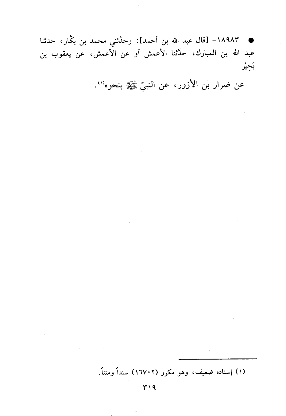 • ١٨٩٨٣ - قَالَ عَبْدُ اللهِ بْنُ أَحْمَدَ: وَحَدَّثَنِي مُحَمَّدُ بْنُ بَكَّارٍ، حَدَّثَنَا عَبْدُ اللهِ بْنُ الْمُبَارَكِ، حَدَّثَنَا الْأَعْمَشُ، أَوْ عَنْ الْأَعْمَشِ، عَنْ يَعْقُوبَ بْنِ بَحِيرٍ، عَنْ ضِرَارِ بْنِ الْأَزْوَرِ، عَنِ النَّبِيِّ صَلَّى اللهُ عَلَيْهِ وَسَلَّمَ، بِنَحْوِهِ (١)
