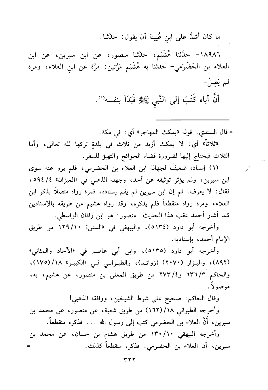 ١٨٩٨٦ - حَدَّثَنَا هُشَيْمٌ، حَدَّثَنَا مَنْصُورٌ، عَنِ ابْنِ سِيرِينَ، عَنِ ابْنِ الْعَلَاءِ بْنِ الْحَضْرَمِيِّ، قَالَ أَبِي: " حَدَّثَنَا بِهِ هُشَيْمٌ مَرَّتَيْنِ: مَرَّةً عَنْ ابْنِ الْعَلَاءِ، وَمَرَّةً لَمْ يَصِلْ "، " أَنَّ أَبَاهُ، كَتَبَ إِلَى النَّبِيِّ صَلَّى اللهُ عَلَيْهِ وَسَلَّمَ، فَبَدَأَ بِنَفْسِهِ " (١)