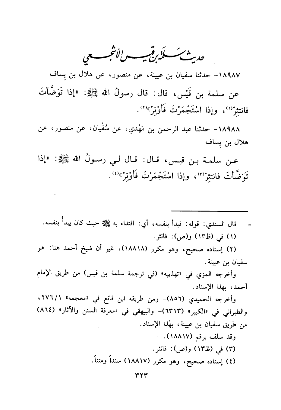 ١٨٩٨٨ - حَدَّثَنَا عَبْدُ الرَّحْمَنِ بْنُ مَهْدِيٍّ، عَنْ سُفْيَانَ، عَنْ مَنْصُورٍ، عَنْ هِلَالِ بْنِ يَسَافٍ، عَنْ سَلَمَةَ بْنِ قَيْسٍ قَالَ: قَالَ رَسُولُ اللهِ صَلَّى اللهُ عَلَيْهِ وَسَلَّمَ: " إِذَا تَوَضَّأْتَ فَانْتَثِرْ، (٣) وَإِذَا اسْتَجْمَرْتَ فَأَوْتِرْ " (٤)