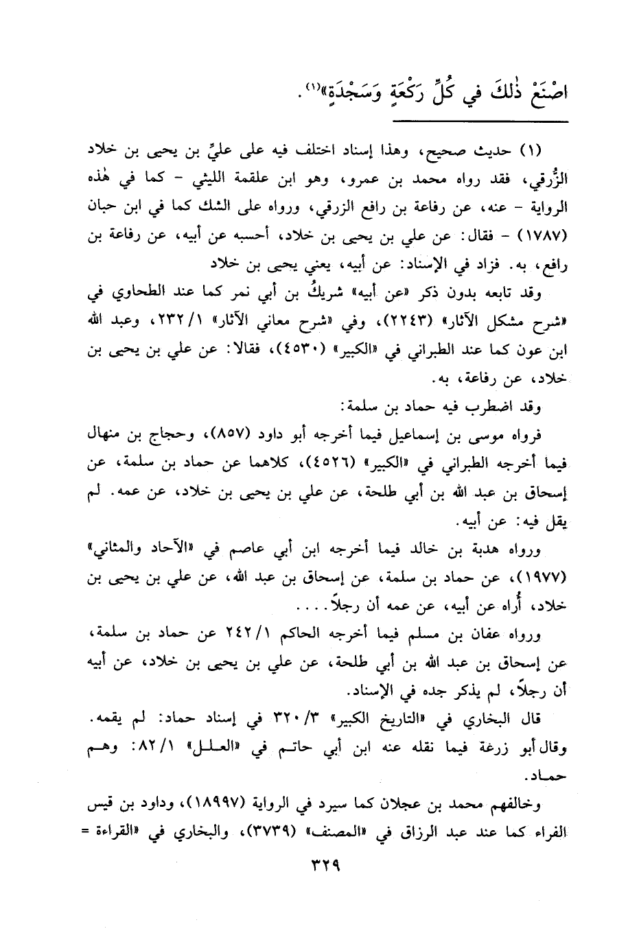 وقد اضطرب فيه حماد بن سلمة: فرواه موسى بن إسماعيل فيما أخرجه أبو داود (٨٥٧) ، وحجاج بن منهال فيما أخرجه الطبراني في "الكبير" (٤٥٢٦) ، كلاهما عن حماد بن سلمة، عن إسحاق بن عبد الله بن أبي طلحة، عن علي بن يحيى بن خلاد، عن عمه. لم يقل فيه: عن أبيه.