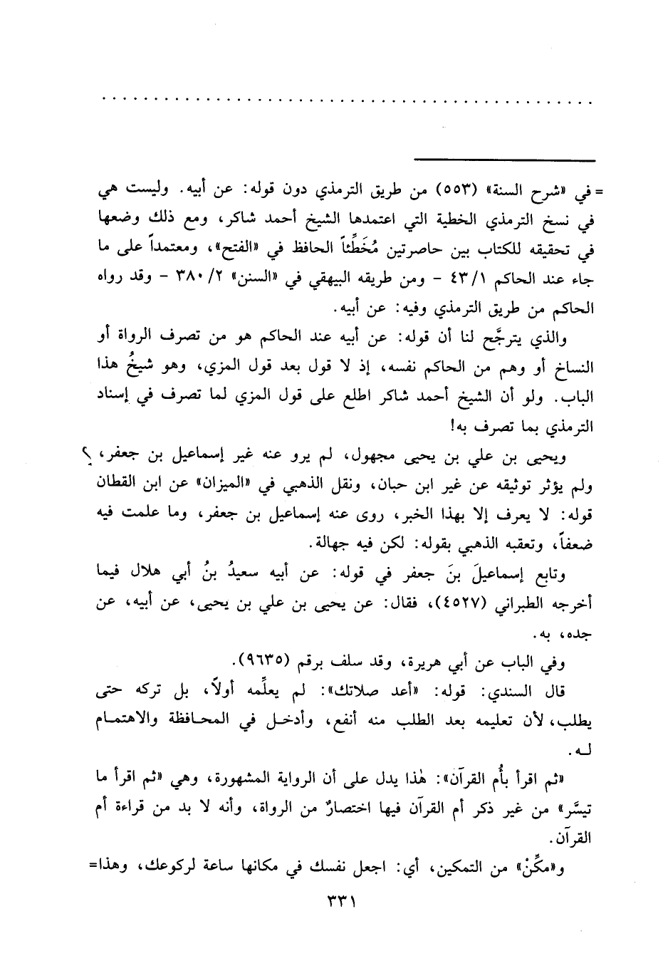 = في "شرح السنة" (٥٥٣) من طريق الترمذي دون قوله: عن أبيه. وليست هي في نسخ الترمذي الخطية التي اعتمدها الشيخ أحمد شاكر، ومع ذلك وضعها في تحقيقه للكتاب بين حاصرتين مُخَطَّئاً الحافظ في "الفتح"، ومعتمداً على ما جاء عند الحاكم ١/٤٣- ومن طريقه البيهقي في "السنن" ٢/٣٨٠- وقد رواه الحاكم من طريق الترمذي وفيه: عن أبيه.