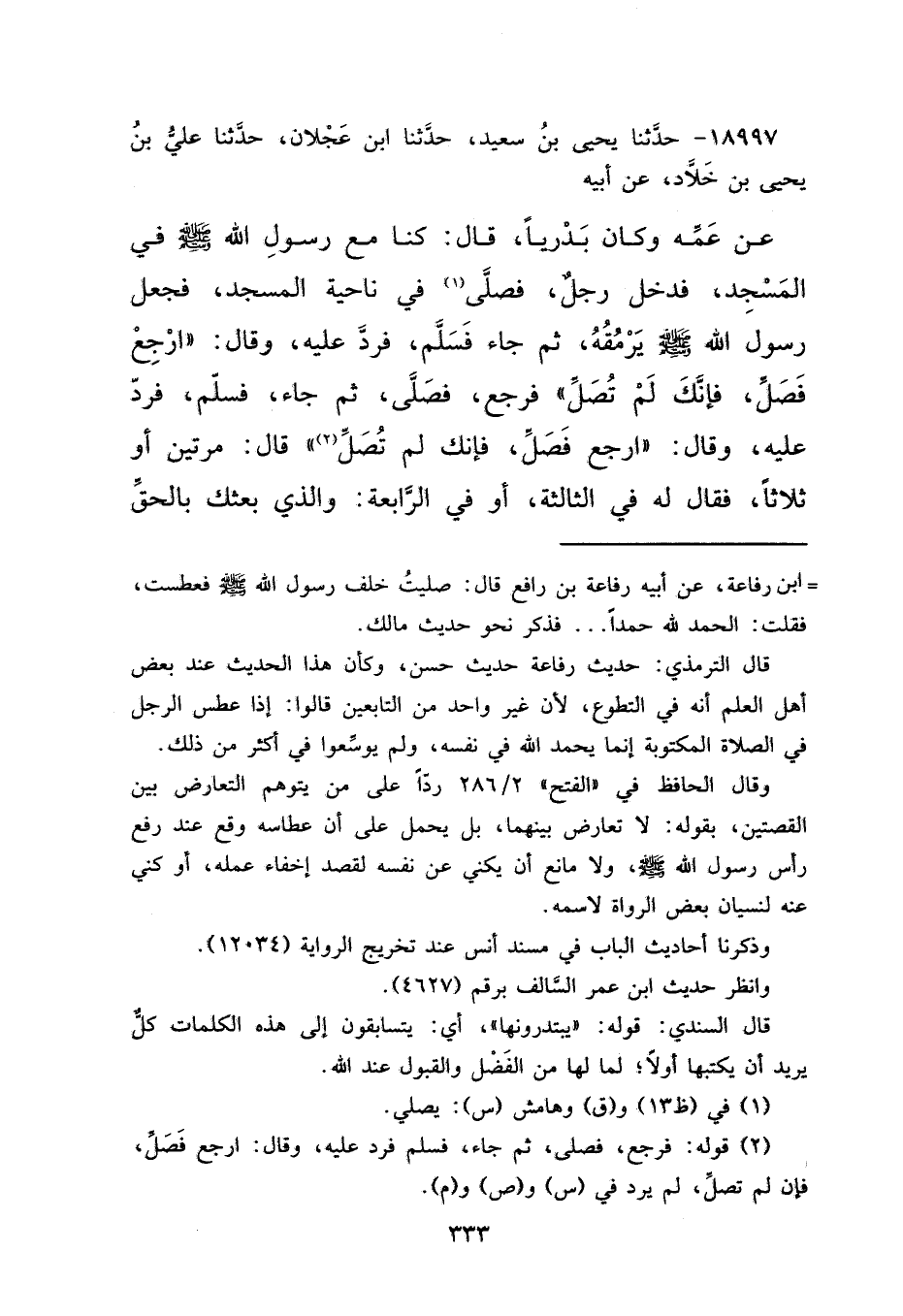 ١٨٩٩٧ - حَدَّثَنَا يَحْيَى بْنُ سَعِيدٍ، حَدَّثَنَا ابْنُ عَجْلَانَ، حَدَّثَنَا عَلِيُّ بْنُ يَحْيَى بْنِ خَلَّادٍ، عَنْ أَبِيهِ، عَنْ عَمِّهِ، وَكَانَ بَدْرِيًّا قَالَ: كُنَّا مَعَ رَسُولِ اللهِ صَلَّى اللهُ عَلَيْهِ وَسَلَّمَ فِي الْمَسْجِدِ، فَدَخَلَ رَجُلٌ، فَصَلَّى (١) فِي نَاحِيَةِ الْمَسْجِدِ، فَجَعَلَ رَسُولُ اللهِ صَلَّى اللهُ عَلَيْهِ وَسَلَّمَ يَرْمُقُهُ، ثُمَّ جَاءَ فَسَلَّمَ فَرَدَّ عَلَيْهِ وَقَالَ: " ارْجِعْ فَصَلِّ، فَإِنَّكَ لَمْ تُصَلِّ " فَرَجَعَ فَصَلَّىَ، ثُمَّ جَاءَ فَسَلَّمَ فَرَدَّ عَلَيْهِ وَقَالَ: " ارْجِعْ فَصَلِّ، فَإِنَّكَ لَمْ تُصَلِّ " (٢) قَالَ مَرَّتَيْنِ أَوْ ثَلَاثًا، فَقَالَ لَهُ فِي الثَّالِثَةِ أَوْ فِي الرَّابِعَةِ: وَالَّذِي بَعَثَكَ بِالْحَقِّ،