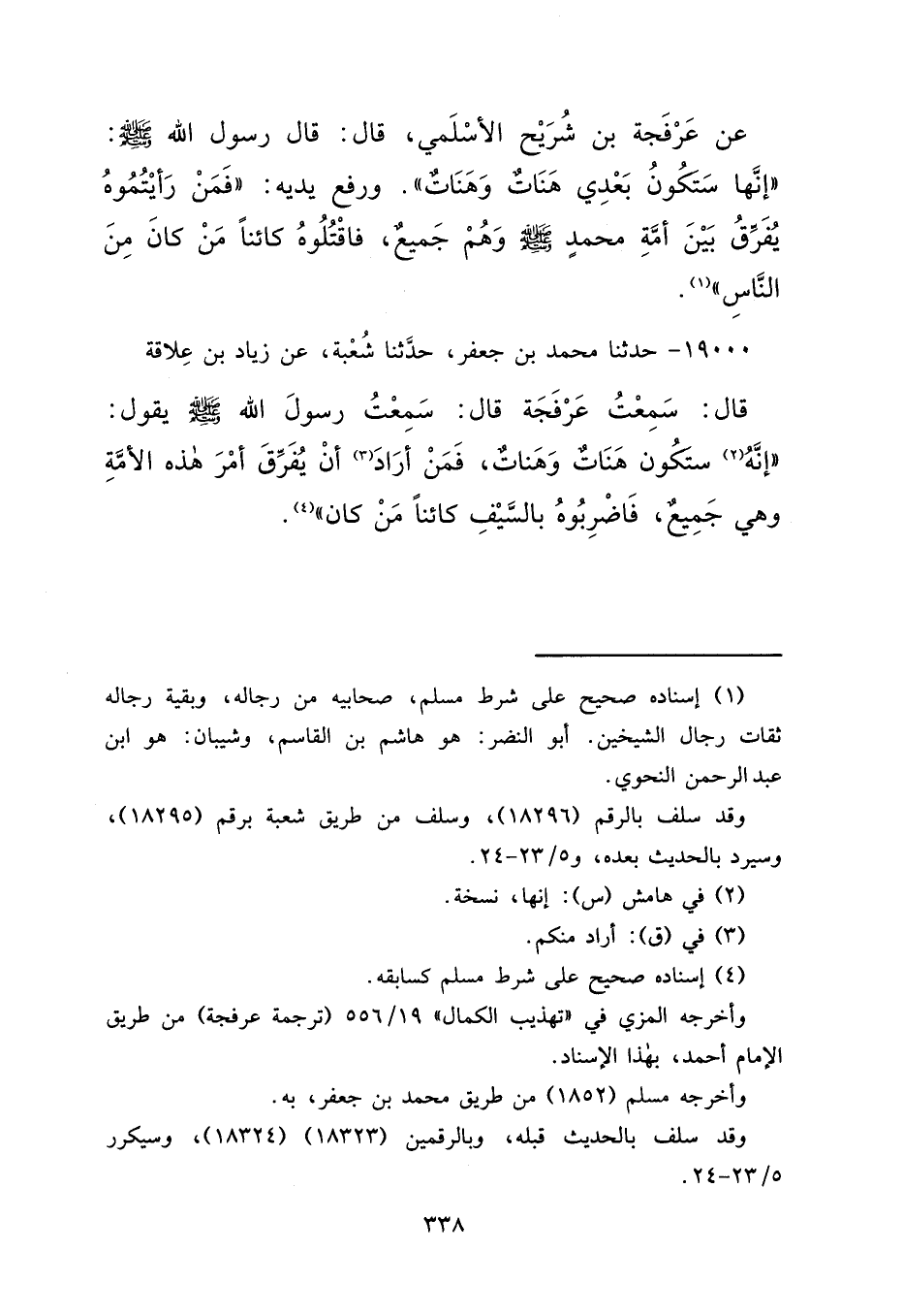 ١٩٠٠٠ - حَدَّثَنَا مُحَمَّدُ بْنُ جَعْفَرٍ، حَدَّثَنَا شُعْبَةُ، عَنْ زِيَادِ بْنِ عِلَاقَةَ، قَالَ: سَمِعْتُ عَرْفَجَةَ قَالَ: سَمِعْتُ رَسُولَ اللهِ صَلَّى اللهُ عَلَيْهِ وَسَلَّمَ يَقُولُ: " إِنَّهُ (٢) سَتَكُونُ هَنَاتٌ وَهَنَاتٌ، فَمَنْ أَرَادَ (٣) أَنْ يُفَرِّقَ أَمْرَ هَذِهِ الْأُمَّةِ، وَهِيَ جَمِيعٌ، فَاضْرِبُوهُ بِالسَّيْفِ كَائِنًا مَنْ كَانَ " (٤)