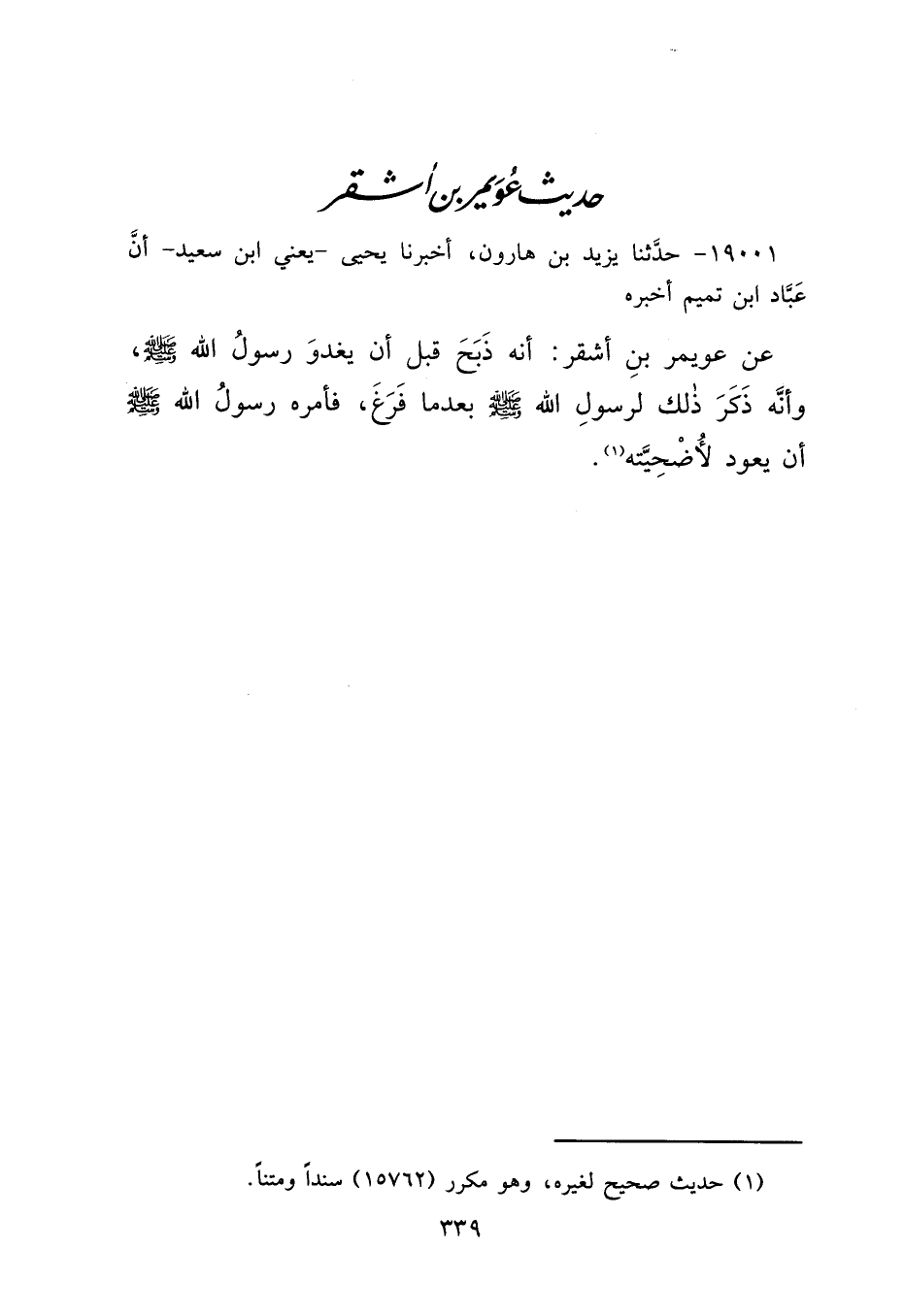 ١٩٠٠١ - حَدَّثَنَا يَزِيدُ بْنُ هَارُونَ، أَخْبَرَنَا يَحْيَى يَعْنِي ابْنَ سَعِيدٍ، أَنَّ عَبَّادَ بْنَ تَمِيمٍ، أَخْبَرَهُ، عَنْ عُوَيْمِرِ بْنِ أَشْقَرَ، أَنَّهُ ذَبَحَ قَبْلَ أَنْ يَغْدُوَ رَسُولُ اللهِ صَلَّى اللهُ عَلَيْهِ وَسَلَّمَ، وَأَنَّهُ ذَكَرَ ذَلِكَ لِرَسُولِ اللهِ صَلَّى اللهُ عَلَيْهِ وَسَلَّمَ بَعْدَمَا فَرَغَ، " فَأَمَرَهُ رَسُولُ اللهِ صَلَّى اللهُ عَلَيْهِ وَسَلَّمَ، أَنْ يَعُودَ لِأُضْحِيَّتِهِ " (١)