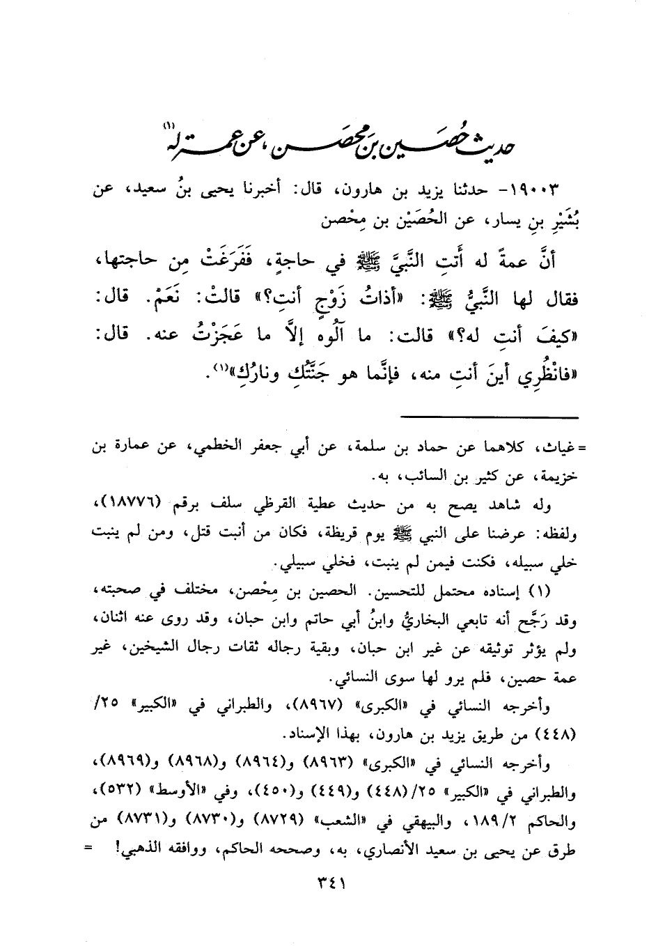 ١٩٠٠٣ - حَدَّثَنَا يَزِيدُ بْنُ هَارُونَ، قَالَ: أَخْبَرَنَا يَحْيَى بْنُ سَعِيدٍ، عَنْ بُشَيْرِ بْنِ يَسَارٍ، عَنِ الْحُصَيْنِ بْنِ مِحْصَنٍ، أَنَّ عَمَّةً لَهُ أَتَتِ النَّبِيَّ صَلَّى اللهُ عَلَيْهِ وَسَلَّمَ فِي حَاجَةٍ، فَفَرَغَتْ مِنْ حَاجَتِهَا، فَقَالَ لَهَا النَّبِيُّ صَلَّى اللهُ عَلَيْهِ وَسَلَّمَ: " أَذَاتُ زَوْجٍ أَنْتِ؟ " قَالَتْ: نَعَمْ، قَالَ: " كَيْفَ أَنْتِ لَهُ؟ " قَالَتْ: مَا آلُوهُ إِلَّا مَا عَجَزْتُ عَنْهُ، قَالَ: " فَانْظُرِي أَيْنَ أَنْتِ مِنْهُ، فَإِنَّمَا هُوَ جَنَّتُكِ وَنَارُكِ " (١)