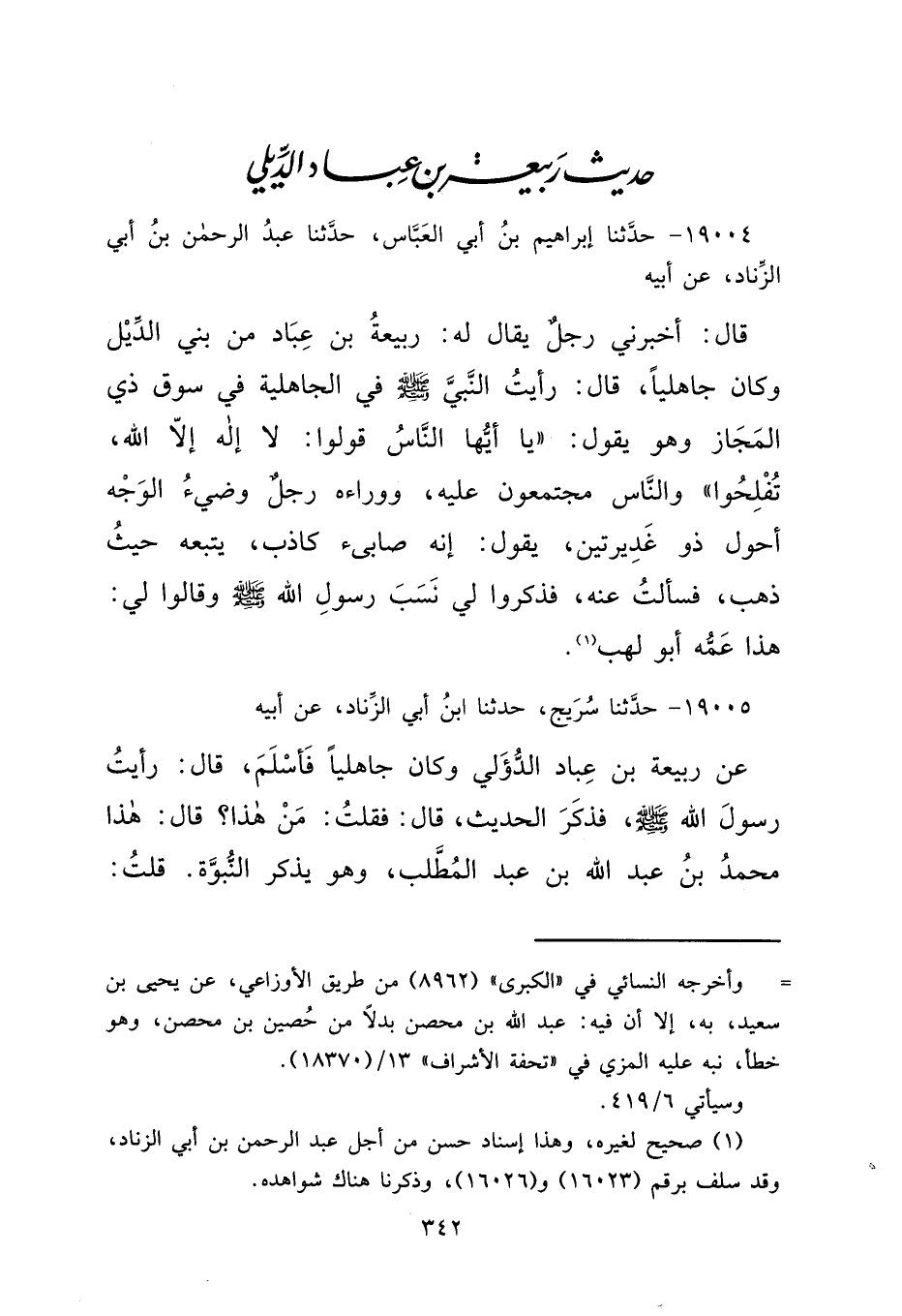 ١٩٠٠٥ - حَدَّثَنَا سُرَيْجٌ، حَدَّثَنَا ابْنُ أَبِي الزِّنَادِ، عَنْ أَبِيهِ، عَنْ رَبِيعَةَ بْنِ عَبَّادٍ الدُّؤَلِيِّ، وَكَانَ جَاهِلِيًّا فَأَسْلَمَ، قَالَ: رَأَيْتُ رَسُولَ اللهِ صَلَّى اللهُ عَلَيْهِ وَسَلَّمَ، فَذَكَرَ الْحَدِيثَ، قَالَ: فَقُلْتُ: مَنْ هَذَا؟ قَالَ: هَذَا مُحَمَّدُ بْنُ عَبْدِ اللهِ بْنِ عَبْدِ الْمُطَّلِبِ وَهُوَ يَذْكُرُ النُّبُوَّةَ، قُلْتُ: