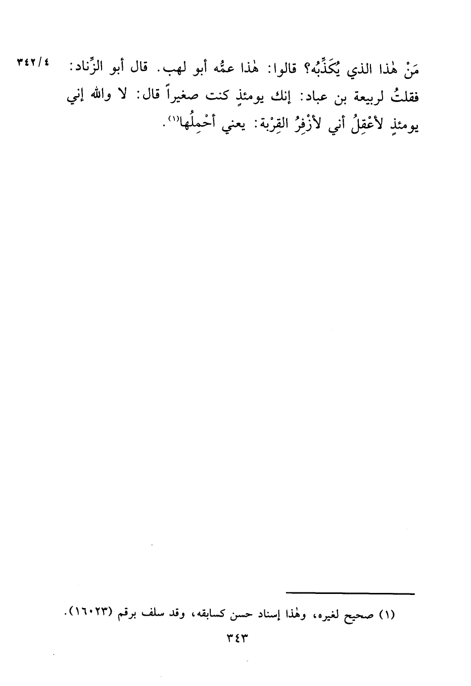 مَنْ هَذَا الَّذِي يُكَذِّبُهُ؟ قَالُوا: هَذَا عَمُّهُ أَبُو لَهَبٍ، قَالَ أَبُو الزِّنَادِ: فَقُلْتُ لِرَبِيعَةَ بْنِ عَبَّادٍ: إِنَّكَ يَوْمَئِذٍ كُنْتَ صَغِيرًا، قَالَ: لَا وَاللهِ إِنِّي يَوْمَئِذٍ لَأَعْقِلُ، أَنِّي لَأَزْفِرُ الْقِرْبَةَ يَعْنِي أَحْمِلُهَا (١)