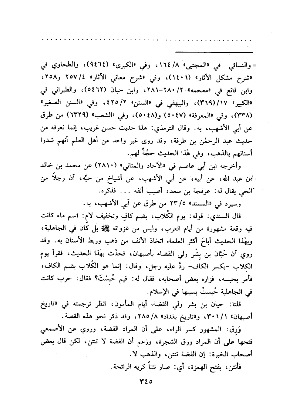 قال السندي: قوله. يوم الكُلاب، بضم كافٍ وتخفيف لامٍ: اسم ماء كانت فيه وقعة مشهورة من أيام العرب، وليس من غزواته صَلَّى اللهُ عَلَيْهِ وَسَلَّمَ بل كان في الجاهلية، وبهذا الحديث أباح أكثر العلماء اتخاذ الأنف من ذهب وربط الأسنان به. وقد روي أن حَيَّان بن بِشْر ولي القضاء بأصبهان، فحدَث بهذا الحديث، فقرأ يوم الكِلاب- بكسر الكاف- ردَّ عليه رجل، وقال- إنما هو الكلاب بضم الكاف، فأمر بحبسه، فزاره بعض أصحابه، فقال له: فيم حُبستَ؟ فقال: حرب كانت في الجاهلية حُبست بسببها في الإسلام.