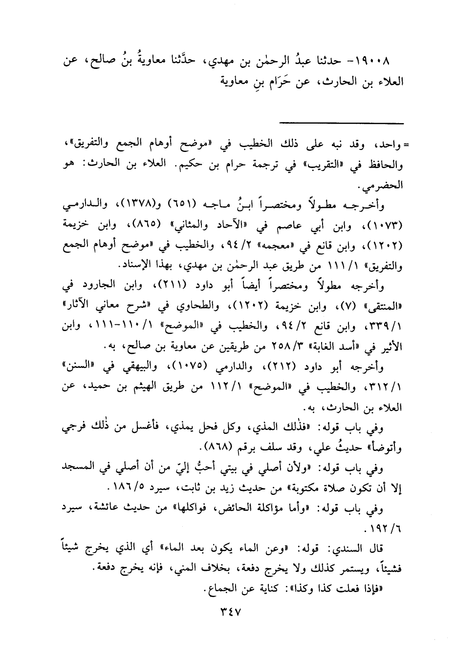 ١٩٠٠٨ - حَدَّثَنَا عَبْدُ الرَّحْمَنِ بْنُ مَهْدِيٍّ، حَدَّثَنَا مُعَاوِيَةُ بْنُ صَالِحٍ، عَنِ الْعَلَاءِ بْنِ الْحَارِثِ، عَنْ حَرَامِ بْنِ مُعَاوِيَةَ،