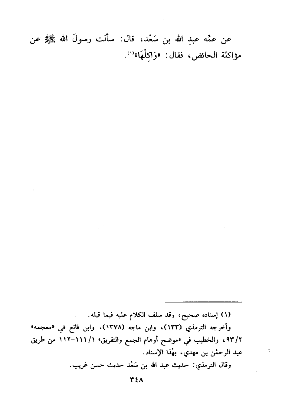 عَنْ عَمِّهِ عَبْدِ اللهِ بْنِ سَعْدٍ قَالَ: سَأَلْتُ رَسُولَ اللهِ صَلَّى اللهُ عَلَيْهِ وَسَلَّمَ، عَنْ مُؤَاكَلَةِ الْحَائِضِ؟ فَقَالَ: " وَاكِلْهَا " (١)