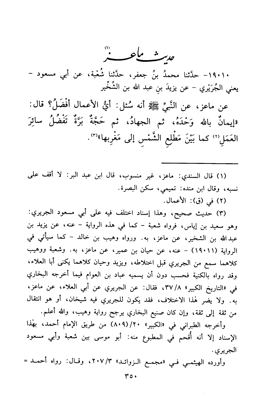 ١٩٠١٠ - حَدَّثَنَا مُحَمَّدُ بْنُ جَعْفَرٍ، حَدَّثَنَا شُعْبَةُ، عَنْ أَبِي مَسْعُودٍ يَعْنِي الْجُرَيْرِيَّ، عَنْ يَزِيدَ بْنِ عَبْدِ اللهِ بْنِ الشِّخِّيرِ، عَنْ مَاعِزٍ، عَنِ النَّبِيِّ صَلَّى اللهُ عَلَيْهِ وَسَلَّمَ أَنَّهُ سُئِلَ أَيُّ الْأَعْمَالِ أَفْضَلُ؟ قَالَ: " إِيمَانٌ بِاللهِ وَحْدَهُ، ثُمَّ الْجِهَادُ، ثُمَّ حَجَّةٌ بَرَّةٌ تَفْضُلُ سَائِرَ الْعَمَلِ (٢) كَمَا بَيْنَ مَطْلَعِ الشَّمْسِ إِلَى مَغْرِبِهَا "، (٣)