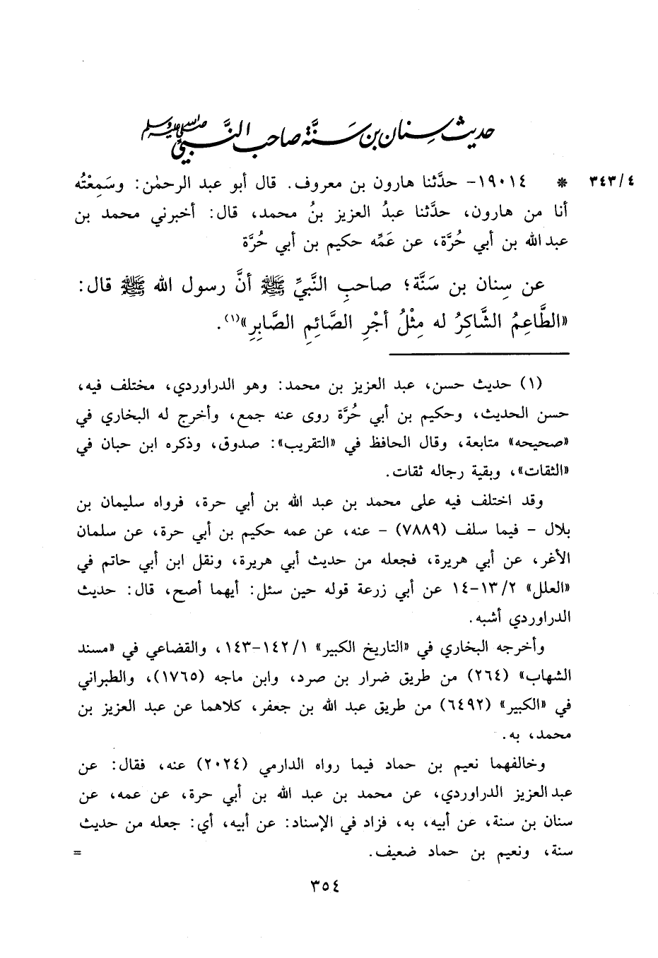 * ١٩٠١٤ - حَدَّثَنَا هَارُونُ بْنُ مَعْرُوفٍ، قَالَ أَبُو عَبْدِ الرَّحْمَنِ: وَسَمِعْتُهُ أَنَا مِنْ هَارُونَ، حَدَّثَنَا عَبْدُ الْعَزِيزِ بْنُ مُحَمَّدٍ، قَالَ: أَخْبَرَنِي مُحَمَّدُ بْنُ عَبْدِ اللهِ بْنِ أَبِي حُرَّةَ، عَنْ عَمِّهِ حَكِيمِ بْنِ أَبِي حُرَّةَ عَنْ سِنَانِ بْنِ سَنَّةَ، صَاحِبِ النَّبِيِّ صَلَّى اللهُ عَلَيْهِ وَسَلَّمَ، أَنَّ رَسُولَ اللهِ صَلَّى اللهُ عَلَيْهِ وَسَلَّمَ قَالَ: " الطَّاعِمُ الشَّاكِرُ لَهُ مِثْلُ أَجْرِ الصَّائِمِ الصَّابِرِ "، (١)