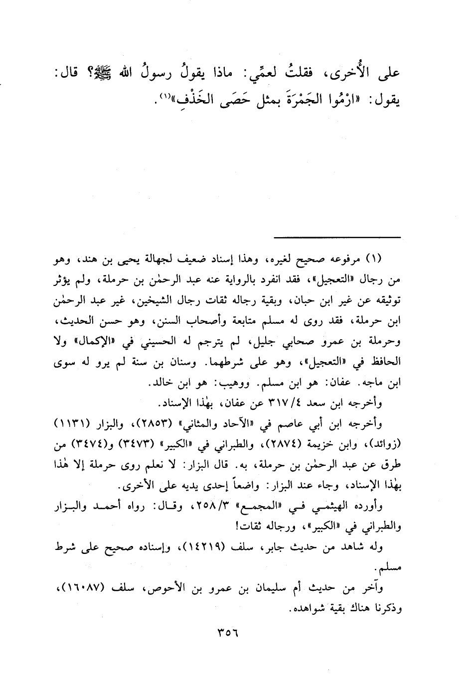 عَلَى الْأُخْرَى، فَقُلْتُ لِعَمِّي: مَاذَا يَقُولُ رَسُولُ اللهِ صَلَّى اللهُ عَلَيْهِ وَسَلَّمَ؟ قَالَ: يَقُولُ: " ارْمُوا الْجَمْرَةَ بِمِثْلِ حَصَى الْخَذْفِ " (١)