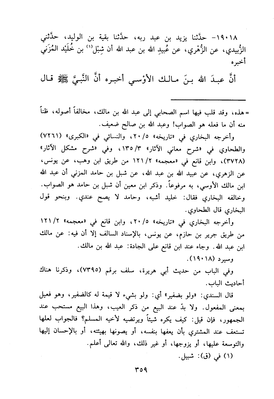 ١٩٠١٨ - حَدَّثَنَا يَزِيدُ بْنُ عَبْدِ رَبِّهِ، حَدَّثَنَا بَقِيَّةُ بْنُ الْوَلِيدِ، حَدَّثَنِي الزُّبَيْدِيُّ، عَنِ الزُّهْرِيِّ، عَنْ عُبَيْدِ اللهِ بْنِ عَبْدِ اللهِ، أَنَّ شِبْلَ (١) بْنَ خُلَيْدٍ الْمُزَنِيَّ أَخْبَرَهُ، أَنَّ عَبْدَ اللهِ بْنَ مَالِكٍ الْأَوْسِيَّ أَخْبَرَهُ، أَنَّ النَّبِيَّ صَلَّى اللهُ عَلَيْهِ وَسَلَّمَ قَالَ