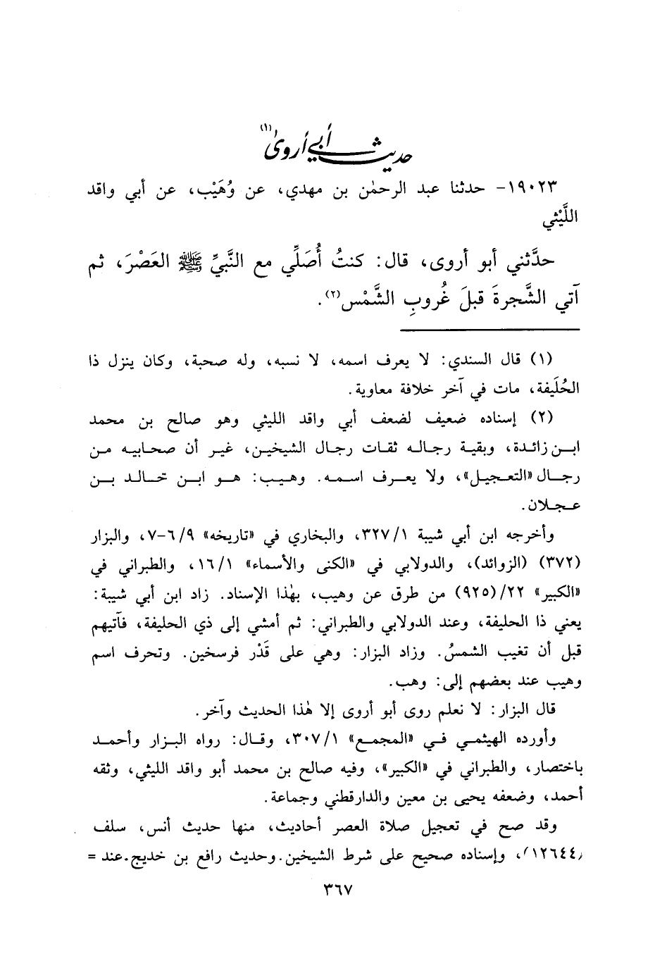 ١٩٠٢٣ - حَدَّثَنَا عَبْدُ الرَّحْمَنِ بْنُ مَهْدِيٍّ، عَنْ وُهَيْبٍ، عَنْ أَبِي وَاقِدٍ اللَّيْثِيِّ، حَدَّثَنِي أَبُو أَرْوَى قَالَ: كُنْتُ " أُصَلِّي مَعَ النَّبِيِّ صَلَّى اللهُ عَلَيْهِ وَسَلَّمَ الْعَصْرَ، ثُمَّ آتِي الشَّجَرَةَ قَبْلَ غُرُوبِ الشَّمْسِ " (٢)
