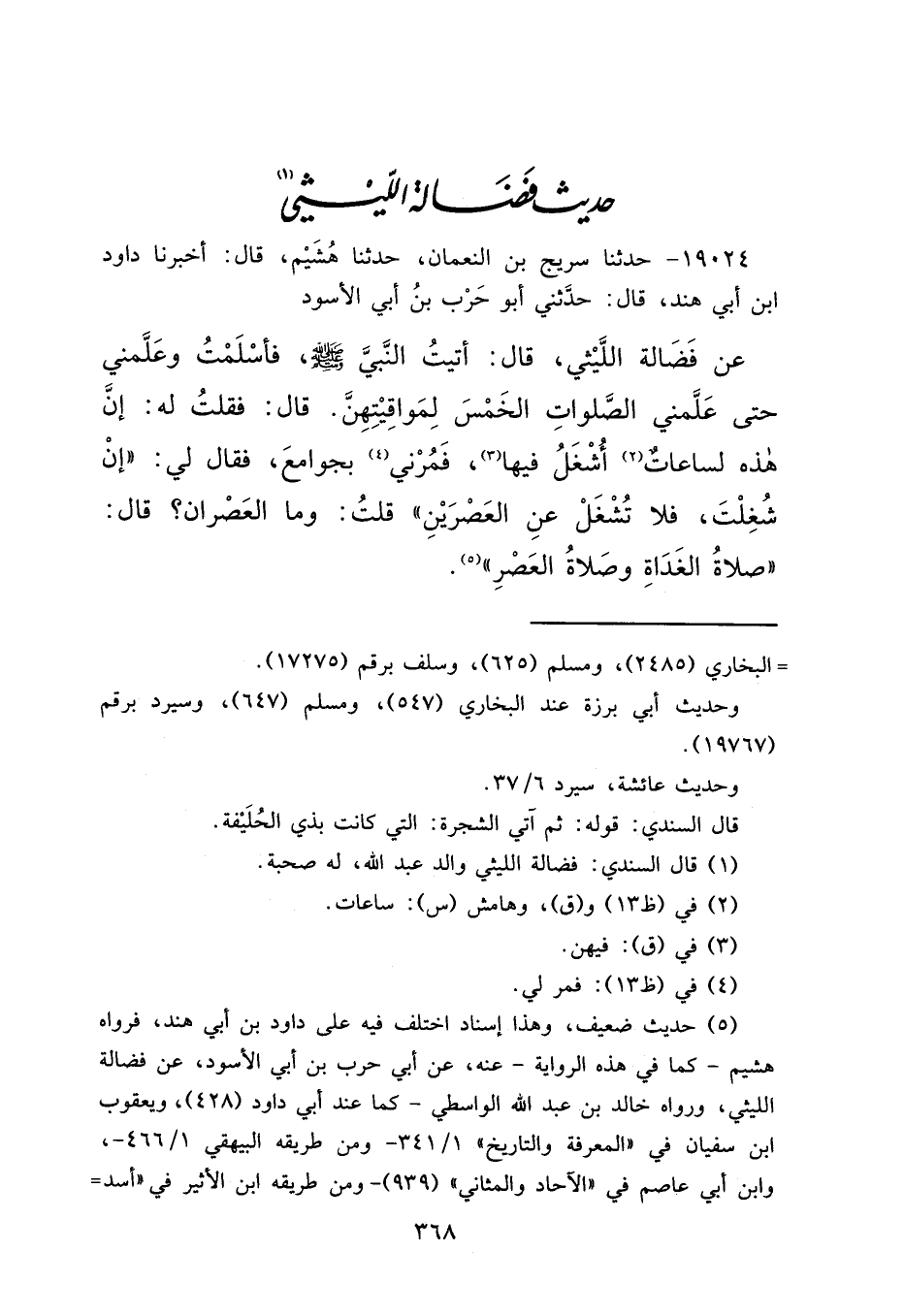 ١٩٠٢٤ - حَدَّثَنَا سُرَيْجُ بْنُ النُّعْمَانِ، حَدَّثَنَا هُشَيْمٌ، قَالَ: أَخْبَرَنَا دَاوُدُ بْنُ أَبِي هِنْدٍ قَالَ: حَدَّثَنِي أَبُو حَرْبِ بْنُ أَبِي الْأَسْوَدِ، عَنْ فَضَالَةَ اللَّيْثِيِّ قَالَ: أَتَيْتُ النَّبِيَّ صَلَّى اللهُ عَلَيْهِ وَسَلَّمَ فَأَسْلَمْتُ، وَعَلَّمَنِي حَتَّى عَلَّمَنِي الصَّلَوَاتِ الْخَمْسَ لِمَوَاقِيتِهِنَّ قَالَ: فَقُلْتُ لَهُ: إِنَّ هَذِهِ لَسَاعَاتٌ (٢) أُشْغَلُ فِيهَا، (٣) فَمُرْنِي (٤) بِجَوَامِعَ، فَقَالَ لِي: " إِنْ شُغِلْتَ فَلَا تُشْغَلْ عَنِ الْعَصْرَيْنِ " قُلْتُ: وَمَا الْعَصْرَانِ؟ قَالَ: " صَلَاةُ الْغَدَاةِ، وَصَلَاةُ الْعَصْرِ " (٥)
