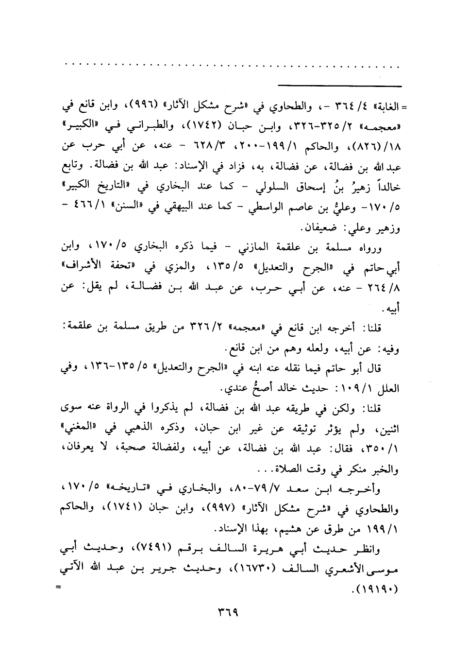 = الغابة" ٤/٣٦٤-، والطحاوي في "شرح مشكل الآثار" (٩٩٦) ، وابن قانع في "معجمه " ٢/٣٢٥-٣٢٦، وابن حبان (١٧٤٢) ، والطبراني في "الكبير" ١٨/ (٨٢٦) ، والحاكم ١/١٩٩-٢٠٠، ٣/٦٢٨- عنه، عن أبي حرب عن عبد الله بن فضالة، عن فضالة، به، فزاد في الإسناد: عبد الله بن فضالة. وتابع خالداً زهيرُ بنُ إسحاق السلولي- كما عند البخاري في "التاريخ الكبير" ٥/١٧٠- وعلي بن عاصم الواسطي- كما عند البيهقي في "السنن" ١/٤٦٦- وزهير وعلي: ضعيفان.
