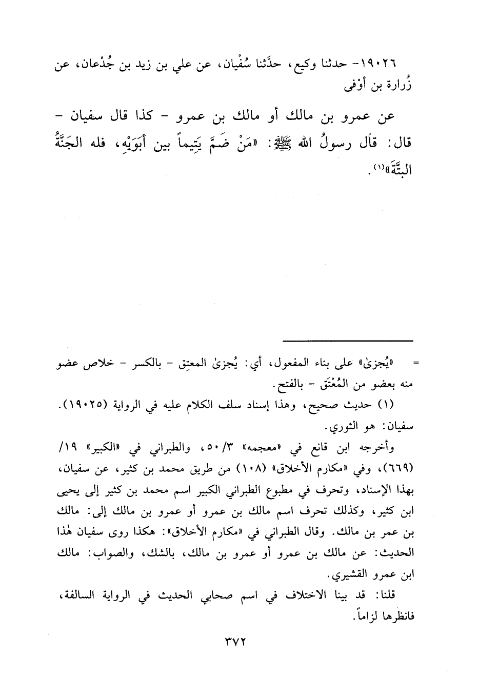 ١٩٠٢٦ - حَدَّثَنَا وَكِيعٌ، حَدَّثَنَا سُفْيَانُ، عَنْ عَلِيِّ بْنِ زَيْدِ بْنِ جُدْعَانَ، عَنْ زُرَارَةَ بْنِ أَوْفَى، عَنْ عَمْرِو بْنِ مَالِكٍ أَوْ مَالِكِ بْنِ عَمْرٍو كَذَا قَالَ: سُفْيَانُ قَالَ: قَالَ رَسُولُ اللهِ صَلَّى اللهُ عَلَيْهِ وَسَلَّمَ: " مَنْ ضَمَّ يَتِيمًا بَيْنَ أَبَوَيْهِ، فَلَهُ الْجَنَّةُ الْبَتَّةَ " (١)