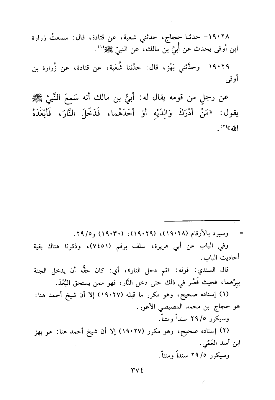 ١٩٠٢٩ - وَحَدَّثَنِي بَهْزٌ قَالَ: حَدَّثَنَا شُعْبَةُ، عَنْ قَتَادَةَ، عَنْ زُرَارَةَ بْنِ أَوْفَى، عَنْ رَجُلٍ مِنْ قَوْمِهِ يُقَالُ لَهُ: أُبَيُّ بْنُ مَالِكٍ، أَنَّهُ سَمِعَ النَّبِيَّ صَلَّى اللهُ عَلَيْهِ وَسَلَّمَ يَقُولُ: " مَنْ أَدْرَكَ وَالِدَيْهِ أَوْ أَحَدَهُمَا، فَدَخَلَ النَّارَ، فَأَبْعَدَهُ اللهُ " (٢)