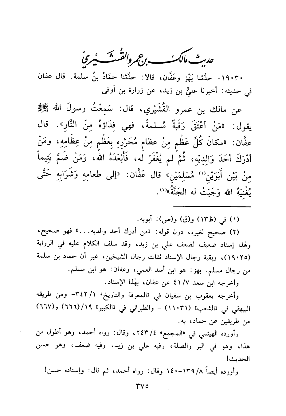 ١٩٠٣٠ - حَدَّثَنَا بَهْزٌ، وَعَفَّانُ، قَالَا: حَدَّثَنَا حَمَّادُ بْنُ سَلَمَةَ، قَالَ عَفَّانُ فِي حَدِيثِهِ: أَخْبَرَنَا عَلِيُّ بْنُ زَيْدٍ، عَنْ زُرَارَةَ بْنِ أَوْفَى، عَنْ مَالِكِ بْنِ عَمْرٍو الْقُشَيْرِيِّ قَالَ: سَمِعْتُ رَسُولَ اللهِ صَلَّى اللهُ عَلَيْهِ وَسَلَّمَ يَقُولُ: " مَنْ أَعْتَقَ رَقَبَةً مُسْلِمَةً، فَهِيَ فِدَاؤُهُ مِنَ النَّارِ " قَالَ: عَفَّانُ: " مَكَانَ كُلِّ عَظْمٍ مِنْ عِظَامِ مُحَرَّرِهِ بِعَظْمٍ مِنْ عِظَامِهِ، وَمَنْ أَدْرَكَ أَحَدَ وَالِدَيْهِ، ثُمَّ لَمْ يُغْفَرْ لَهُ، فَأَبْعَدَهُ اللهُ، وَمَنْ ضَمَّ يَتِيمًا مِنْ بَيْنِ أَبَوَيْنِ (١) مُسْلِمَيْنِ "، قَالَ: عَفَّانُ: " إِلَى طَعَامِهِ وَشَرَابِهِ حَتَّى يُغْنِيَهُ اللهُ وَجَبَتْ لَهُ الْجَنَّةُ " (٢)