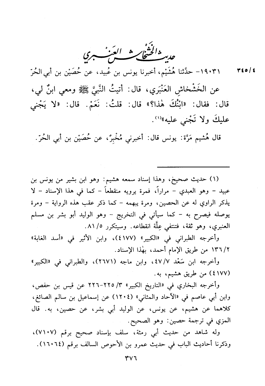 (١) حديث صحيح، وهذا إسناد سمعه هشيم: وهو ابن بشير من يونس بن عبيد- وهو العبدي- مراراً، فمرة يرويه منقطعاً- كما في هذا الإسناد- لا يذكر الراوي له عن الحصين، ومرة يبهمه- كما ذكر عقب هذه الرواية- ومرة يوصله فيصرح به- كما سيأتي في التخريج- وهو الوليد أبو بشر بن مسلم العنبري، وهو ثقة، فتنتفي عِلَة انقطاعه. وسيتكرر ٥/٨١.