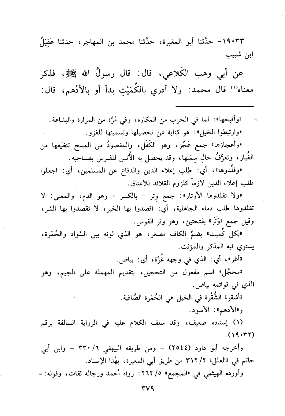 ١٩٠٣٣ - حَدَّثَنَا أَبُو الْمُغِيرَةِ، حَدَّثَنَا مُحَمَّدُ بْنُ الْمُهَاجَرِ، حَدَّثَنَا عَقِيلُ بْنُ شَبِيبٍ، عَنْ أَبِي وَهْبٍ الْكَلَاعِيِّ قَالَ: قَالَ رَسُولُ اللهِ صَلَّى اللهُ عَلَيْهِ وَسَلَّمَ: فَذَكَرَ مَعْنَاهُ، (١) قَالَ: مُحَمَّدٌ وَلَا أَدْرِي بِالْكُمَيْتِ بَدَأَ أَوْ بِالْأَدْهَمِ، قَالَ: