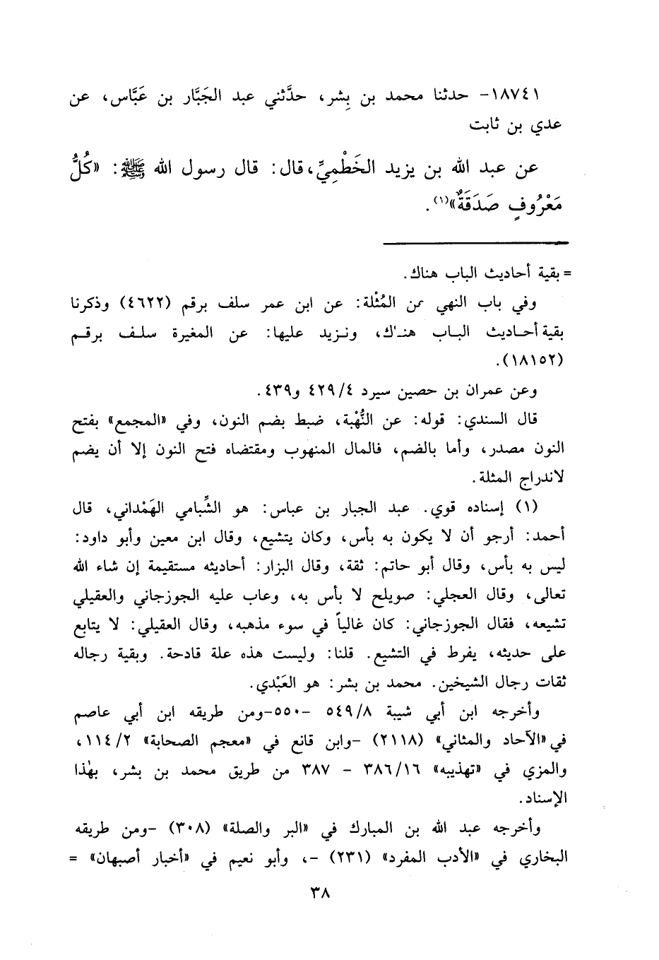 ١٨٧٤١ - حَدَّثَنَا مُحَمَّدُ بْنُ بِشْرٍ، حَدَّثَنِي عَبْدُ الْجَبَّارِ بْنُ عَبَّاسٍ، عَنْ عَدِيِّ بْنِ ثَابِتٍ، عَنْ عَبْدِ اللهِ بْنِ يَزِيدَ الْخَطْمِيِّ قَالَ: قَالَ رَسُولُ اللهِ صَلَّى اللهُ عَلَيْهِ وَسَلَّمَ: " كُلُّ مَعْرُوفٍ صَدَقَةٌ " (١)